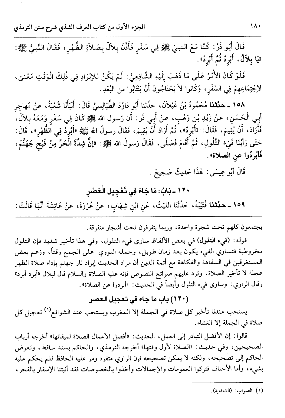 [159] يستحب عندنا تأخير كل صلاة في الجملة إلا المغرب ويستحب عند الشوافع تعجيل كل صلاة في الجملة إلا العشاء.