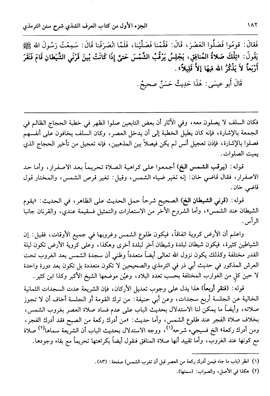واعلم أن الأرض كروية اتفاقاً، فيكون طلوع الشمس وغروبها في جميع الأوقات، فقيل: إن الشياطين كثيرة، فيكون شيطان لبلدة وشيطان آخر لبلدة أخرى وهكذا، وعلى كروية الأرض تكون ليلة القدر مختلفة وكذلك يكون نزول الله تعالى أيضاً متعدداً وظني أن سجدة الشمس بعد الغروب تحت العرش المذكور في حديث أبي ذر في الترمذي والصحيحين لا تكون متعددة بل تكون بعد دورة واحدة لا حين كلٍ من الغوارب المختلفة بحسب تعدد البلاد، وعيَّن موضعها الشيخ الأكبر وكذا ابن كثير.