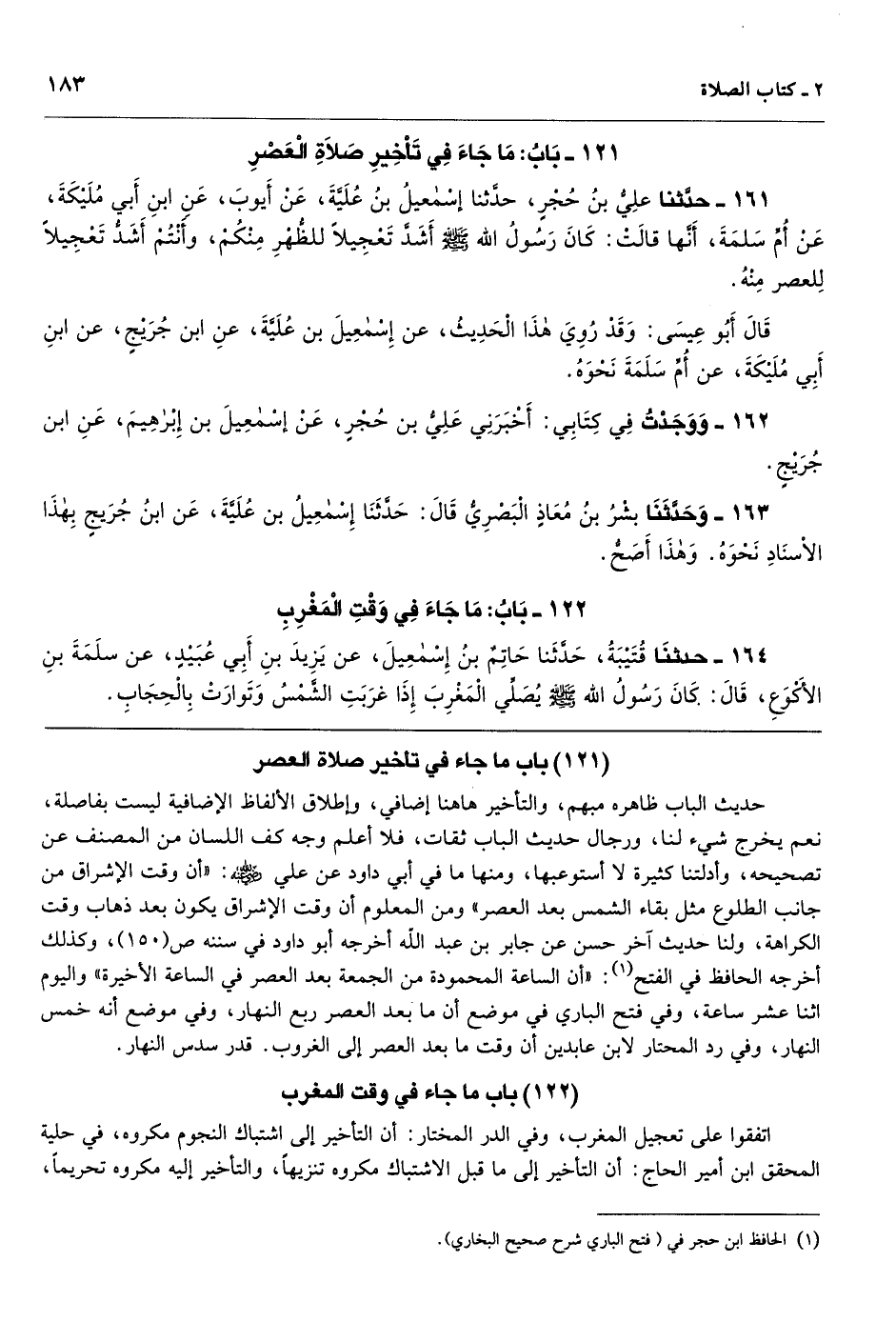 [161] حديث الباب ظاهره مبهم، والتأخير هاهنا إضافي، وإطلاق الألفاظ الإضافية ليست بفاصلة، نعم يخرج شيء لنا، ورجال حديث الباب ثقات، فلا أعلم وجه كف اللسان من المصنف عن تصحيحه، وأدلتنا كثيرة لا أستوعبها، ومنها ما في أبي داود عن علي: «أن وقت الإشراق من جانب الطلوع مثل بقاء الشمس بعد العصر» ومن المعلوم أن وقت الإشراق يكون بعد ذهاب وقت الكراهة، ولنا حديث آخر حسن عن جابر بن عبد الله أخرجه أبو داود في سننه ص (150) ، وكذلك أخرجه الحافظ في الفتح: «أن الساعة المحمودة من الجمعة بعد العصر في الساعة الأخيرة» واليوم اثنا عشر ساعة، وفي فتح الباري في موضع أن ما بعد العصر ربع النهار، وفي موضع أنه خمس النهار، وفي رد المحتار لابن عابدين أن وقت ما بعد العصر إلى الغروب. قدر سدس النهار.
