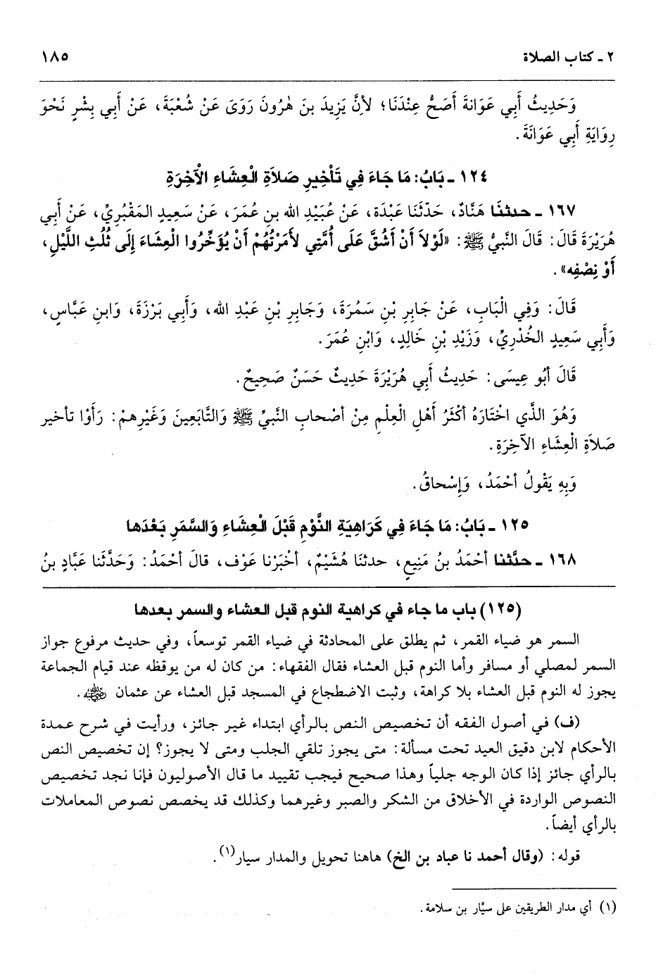 [168] السمر هو ضياء القمر، ثم يطلق على المحادثة في ضياء القمر توسعاً، وفي حديث مرفوع جواز السمر لمصلي أو مسافر وأما النوم قبل العشاء فقال الفقهاء: من كان له من يوقظه عند قيام الجماعة يجوز له النوم قبل العشاء بلا كراهة، وثبت الاضطجاع في المسجد قبل العشاء عن عثمان.