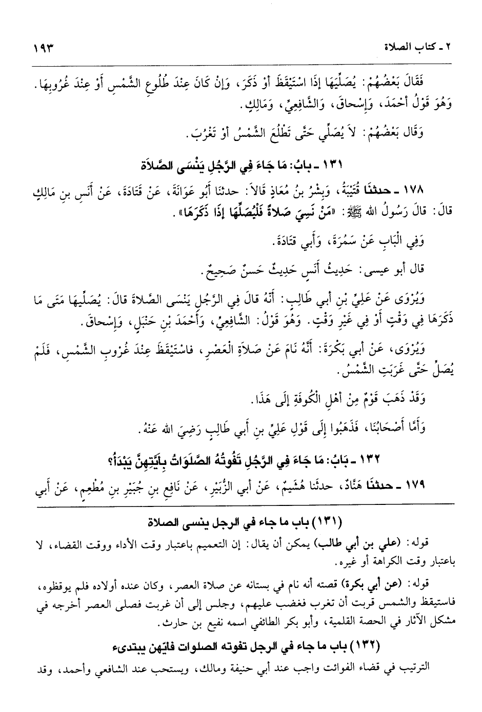 [178] قوله: (علي بن أبي طالب) يمكن أن يقال: إن التعميم باعتبار وقت الأداء ووقت القضاء، لا باعتبار وقت الكراهة أو غيره.