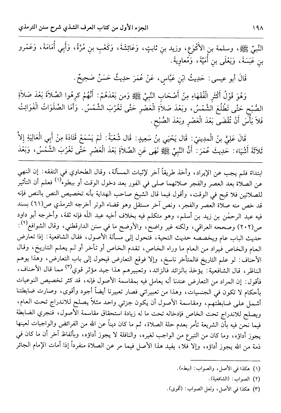 ابتداءً فلم يجب عن الإيراد، وأخذ طريقاً آخر لإثبات المسألة، وقال الطحاوي في التفقه: إن النهي عن الصلاة بعد العصر والفجر صلاتهما صلى في الفور بعد دخول الوقت أو ببطوء فعلم أن التأثير للصلاتين فلا قبح في الوقت، وأقول فيما قال الشيخ صاحب الهداية بأنه تخصيص النص بالنص فإنه قد خص منه صلاة العصر والفجر، ونص آخر مستقل وهو قضاء الوتر أخرجه الترمذي ص (61) بسند فيه عبد الرحمن بن زيد بن أسلم، وهو متكلم فيه بخلاف أخيه عبد الله فإنه ثقة، وأخرجه أبو داود ص (202) وصححه العراقي، ولكنه غير واضح، والأوضح ما في سنن الدارقطني، وقال الشوافع: حديث الباب عام ويخصصه حديث التحية، فتحول إلى مسألة الأصول، فقال الشافعية: إذا تعارض العام والخاص فيراد من العام ما وراء الخاص، تقدم الخاص أو تأخر أو لم يعلم التاريخ، وقال الأحناف: لو علم التاريخ فالمتأخر ناسخ، وإلا فوقع التعارض فيحول إلى باب التعارض، وهذا يوهم الناظر، قال الشافعية: يؤخذ بالزائد فالزائد، وتعبيرهم هذا جيد مؤثر قوي مما قال الأحناف، فأقول: إن المراد من التعارض عندنا أنه يعامل فيه بمقاسمة الأصول فإنه، قد كثر تخصيص النوعيات بأحكام لا تكون في الجنسيات، وهذا من تعبيراتي فصار تعبيرنا أيضاً أجود وأقوى، وصارت ضابطتنا أشمل على ضابطتهم، ومقاسمة الأصول أن يكون جزئي واحد مثلاً يصلح للاندراج تحت العام، ويصلح للاندراج تحت الخاص فإدخاله تحت ما له زيادة استحقاق مقاسمة الأصول، فنجري الضابطة فيما نحن فيه بأن الشريعة تأمر بعدم حلة الصلاة، ثم ما كان ديناً عن الله من الفرائض والواجبات لعينها يجوز أداؤه، وما كان من التبرع من الواجب لغيره، والنافلة لا يجوز أداؤه، وبألفاظ آخر أن ما كان في ذمة من الله يجوز أداؤه، وإلا فلا، يفيد هذا الأصل فيما مر عن الصلاة منفرداً إذا أمات الإمام الجائر
