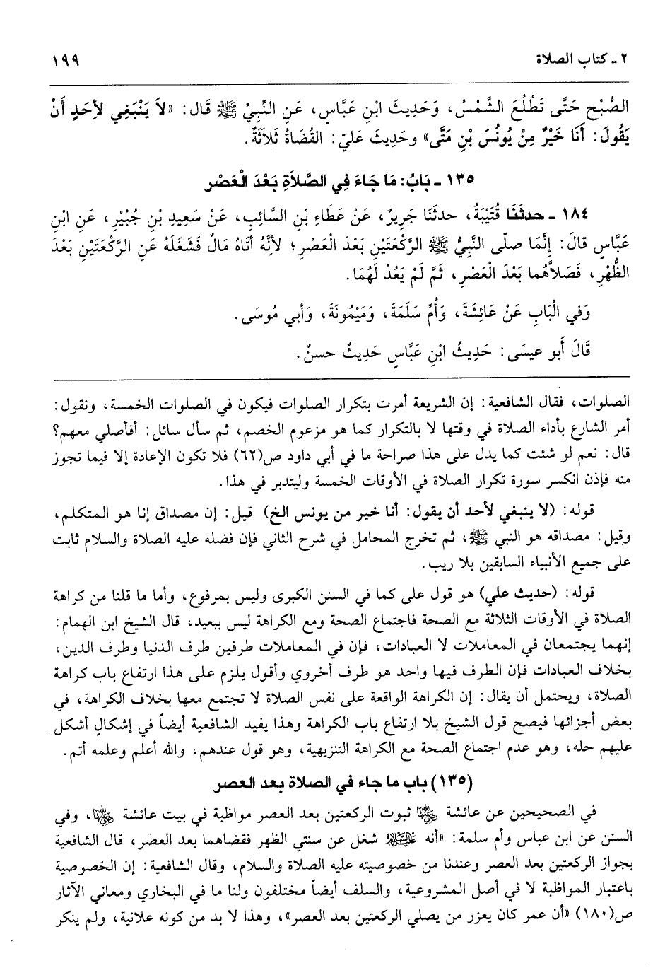 [184] في الصحيحين عن عائشة ثبوت الركعتين بعد العصر مواظبة في بيت عائشة، وفي السنن عن ابن عباس وأم سلمة: «أنه شغل عن سنتي الظهر فقضاهما بعد العصر، قال الشافعية بجواز الركعتين بعد العصر وعندنا من خصوصيته عليه الصلاة والسلام، وقال الشافعية: إن الخصوصية باعتبار المواظبة لا في أصل المشروعية، والسلف أيضاً مختلفون ولنا ما في البخاري ومعاني الآثار ص (180) «أن عمر كان يعزر من يصلي الركعتين بعد العصر» ، وهذا لا بد من كونه علانية، ولم ينكر