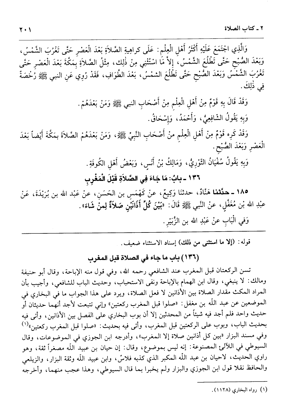 [185] تسن الركعتان قبل المغرب عند الشافعي رحمه الله، وفي قول منه الإباحة، وقال أبو حنيفة ومالك: لا ينبغي، وقال ابن الهمام بالإباحة ونفى الاستحباب، وحديث الباب للشافعي، وأجيب بأن المراد المكث مقدار الصلاة بين الأذانين لا فعل الصلاة، ويرد على هذا الجواب ما في البخاري في الموضعين عن عبد الله بن مغفل: «صلوا قبل المغرب ركعتين» وإني تتبعت لأجد أنهما حديثان أو حديث واحد فلم أجد فيه شيئاً من المحدثين إلا أن بوب البخاري على الفصل بين الأذانين، وأتى فيه بحديث الباب، وبوب على الركعتين قبل المغرب، وأتى فيه بحديث: «صلوا قبل المغرب ركعتين» وفي مسند البزار «بين كل أذانين صلاة إلا المغرب» ، وأدرجه ابن الجوزي في الموضوعات، وقال السيوطي في اللآلئ المصنوعة: إنه ليس بموضوع، وقال: إن حيان بن عبيد الله مصغراً ثقة، وهو راوي الحديث، لاحيان بن عبد الله المكبر الذي كذبه فلاسٌ، وابن عبيد الله وثقة البزار، والزيلعي والحافظ نقلا قول ابن الجوزي والبزار ولم يخبرا بما قال السيوطي، وهذا عجب منهما، وأخرجه