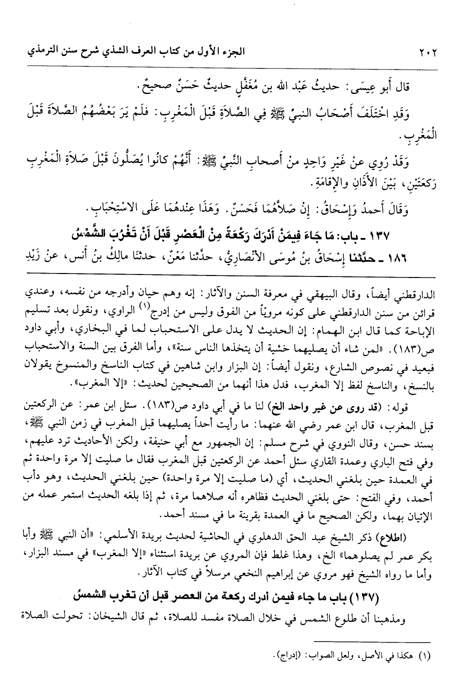 (اطلاع) ذكر الشيخ عبد الحق الدهلوي في الحاشية لحديث بريدة الأسلمي: «أن النبي - صَلَّى اللهُ عَلَيْهِ وَسَلَّمَ - وأبا بكر عمر لم يصلوهما» الخ، وهذا غلط فإن المروي عن بريدة استثناء «إلا المغرب» في مسند البزار، وأما ما رواه الشيخ فهو مروي عن إبراهيم النخعي مرسلاً في كتاب الآثار.