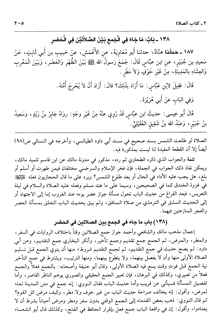 [187] إجمال مذهب مالك والشافعي وأحمد جواز جمع الصلاتين وقتاً باختلاف الروايات في السفر، والمطر، والمرض، ثم الجمع جمع تقديم وجمع تأخير، وأنكر البخاري جمع التقديم، وعن أبي داود: لم يصح حديث في جمع التقديم، ثم لجمع التقديم شروط؛ منها أن ينوي الجمع قبل تسليم الصلاة الأولى منها وأن لا يفصل بينهما، ولا يتطوع بينهما، ومنها الترتيب، ويشترط في جمع التأخير نية الجمع قبل فوت وقت يسع فيه الصلاة الأولى، وقال أبو حنيفة وأصحابه: بالجمع فعلاً والجمع فعلاً من تعبيري، وكذلك في البرهان، فإن تعبير الجمع الحقيقي والصوري يوهم الناظر القاصر، وأما تفصيل المسألة فسيأتي عن قريب وأما حديث الباب فقال النووي: إنه جمع في متن المدينة لعله لمرض، وأقول: إنه يخالف صراحة حديث الباب من غير خوف ولا مطر، وكيف مرض كل القوم؟ ثم قال النووي: ذهب بعض القدماء إلى الجمع الوقتي بدون سفر ومطر ومرض أحياناً بشرط أن لا يعتادوا، وأقول: إن في واقعة الباب جمع فعل بإقرار الحافظ في الفتح، وكذلك قال أبو الشعساء