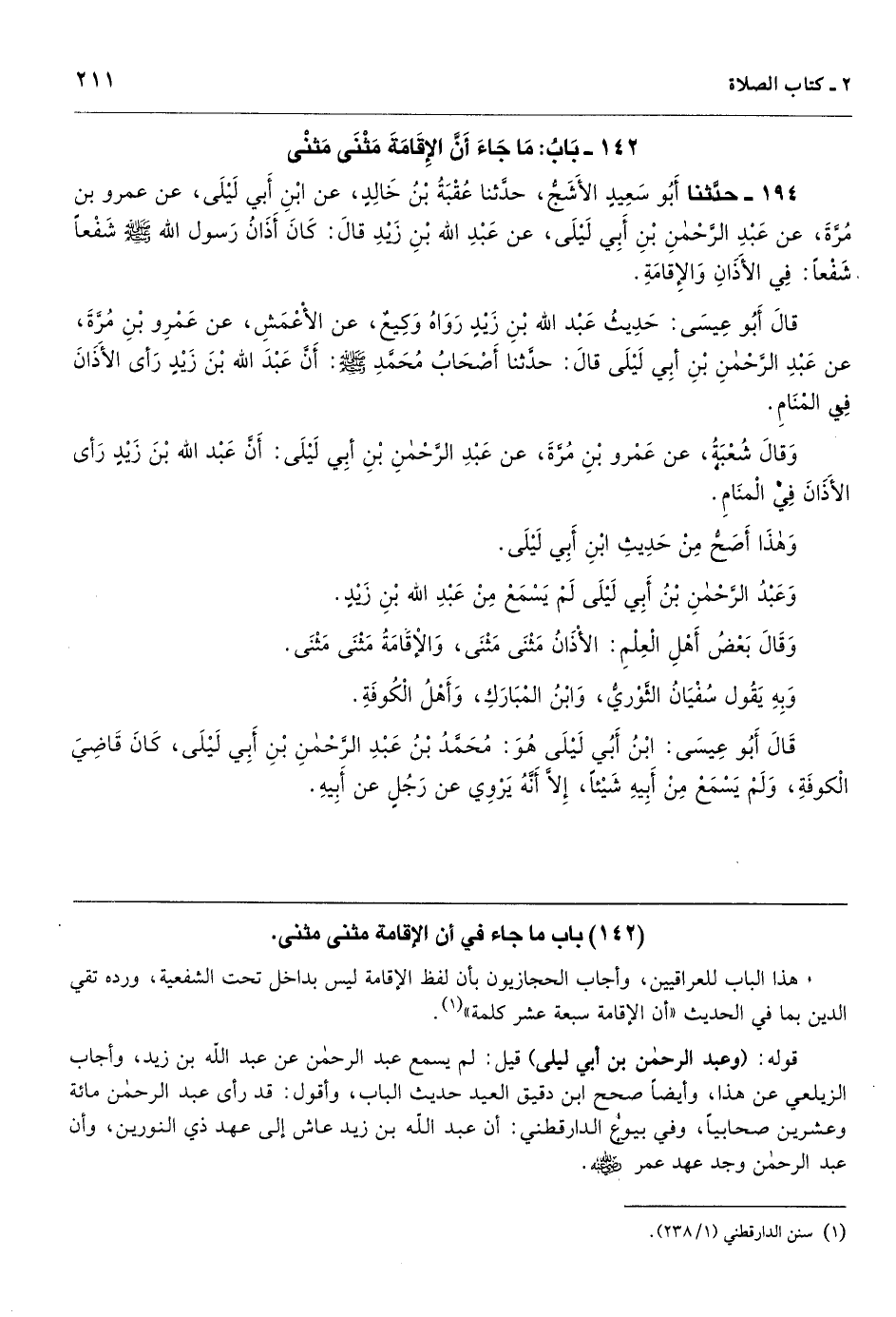 [194] هذا الباب للعراقيين، وأجاب الحجازيون بأن لفظ الإقامة ليس بداخل تحت الشفعية، ورده تقي الدين بما في الحديث «أن الإقامة سبعة عشر كلمة» .