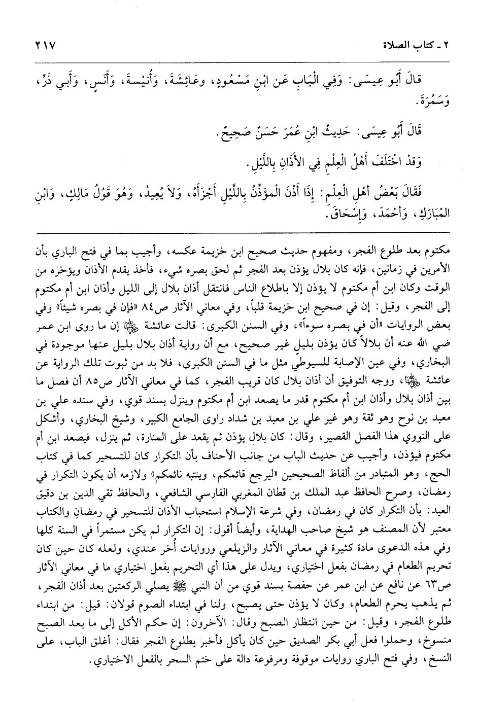 مكتوم بعد طلوع الفجر، ومفهوم حديث صحيح ابن خزيمة عكسه، وأجيب بما في فتح الباري بأن الأمرين في زمانين، فإنه كان بلال يؤذن بعد الفجر ثم لحق بصره شيء، فأخذ يقدم الأذان ويؤخره من الوقت وكان ابن أم مكتوم لا يؤذن إلا باطلاع الناس فانتقل أذان بلال إلى الليل وأذان ابن أم مكتوم إلى الفجر، وقيل: إن في صحيح ابن خزيمة قلباً، وفي معاني الآثار ص84 «فإن في بصره شيئاً» وفي بعض الروايات «أن في بصره سوءاً» ، وفي السنن الكبرى: قالت عائشة إن ما روى ابن عمر ضي الله عنه أن بلالاً كان يؤذن بليلٍ غير صحيح، مع أن رواية أذان بلال بليل عنها موجودة في البخاري، وفي عين الإصابة للسيوطي مثل ما في السنن الكبرى، فلا بد من ثبوت تلك الرواية عن عائشة، ووجه التوفيق أن أذان بلال كان قريب الفجر، كما في معاني الآثار ص85 أن فصل ما بين أذان بلال وأذان ابن أم مكتوم قدر ما يصعد ابن أم مكتوم وينزل بسند قوي، وفي سنده علي بن معبد بن نوح وهو ثقة وهو غير علي بن معبد بن شداد راوى الجامع الكبير، وشيخ البخاري، وأشكل على النووي هذا الفصل القصير، وقال: كان بلال يؤذن ثم يقعد على المنارة، ثم ينزل، فيصعد ابن أم مكتوم فيؤذن، وأجيب عن حديث الباب من جانب الأحناف بأن التكرار كان للتسحير كما في كتاب الحج، وهو المتبادر من ألفاظ الصحيحين «ليرجع قائمكم، وينتبه نائمكم» ولازمه أن يكون التكرار في رمضان، وصرح الحافظ عبد الملك بن قطان المغربي الفارسي الشافعي، والحافظ تقي الدين بن دقيق العيد: بأن التكرار كان في رمضان، وفي شرعة الإسلام استحباب الأذان للتسحير في رمضانِ والكتاب معتبر لأن المصنف هو شيخ صاحب الهداية، وأيضاً أقول: إن التكرار لم يكن مستمراً في السنة كلها وفي هذه الدعوى مادة كثيرة في معاني الآثار والزيلعي وروايات أُخر عندي، ولعله كان حين كان تحريم الطعام في رمضان بفعل اختياري، ويدل على هذا أي