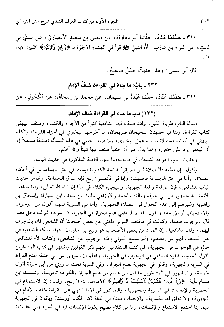 [311] مسألة الباب طويلة الذيل، ولقد صنف فيها الشافعية كثيراً من الأجزاء والكتب، وصنف البيهقي كتاب القراءة، ولنا فيه حديثان صحيحان صريحان، ما أخرجها البخاري في أجزاء القراءة، وتكلم البيهقي في أسانيد مستدلاتنا، وبه عمل البخاري، وما صنف حنفي في هذه المسألة تصنيفاً مستقلاً إلا أن البيهقي يرد على حنفي، وهذا يدل على أن حنفياً صنف فيها شيئاً والله أعلم.