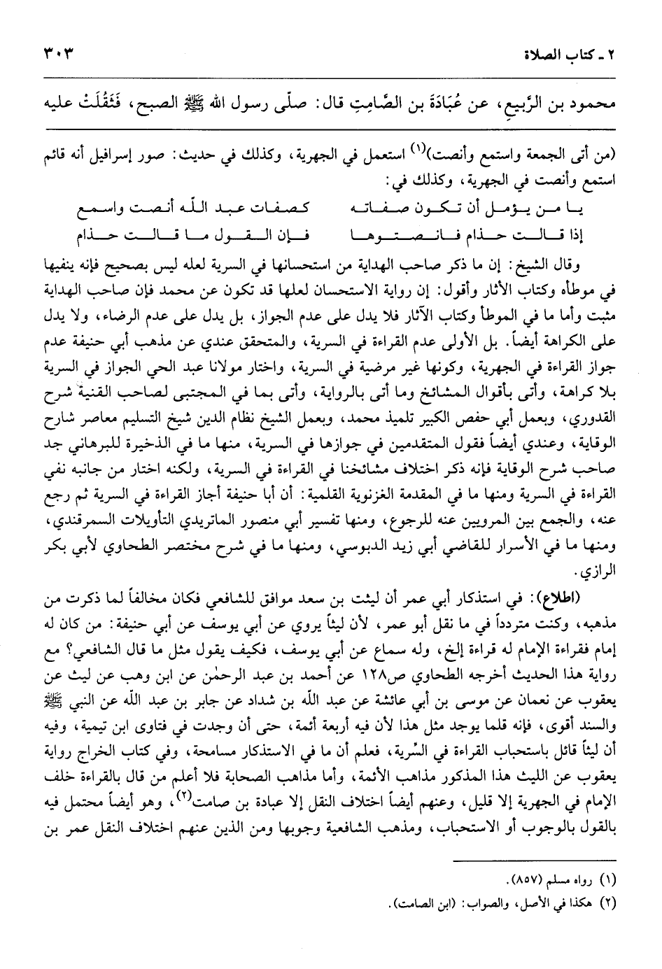 (اطلاع) : في استذكار أبي عمر أن ليثت بن سعد موافق للشافعي فكان مخالفاً لما ذكرت من مذهبه، وكنت متردداً في ما نقل أبو عمر، لأن ليثاً يروي عن أبي يوسف عن أبي حنيفة: من كان له إمام فقراءة الإمام له قراءة إلخ، وله سماع عن أبي يوسف، فكيف يقول مثل ما قال الشافعي؟ مع رواية هذا الحديث أخرجه الطحاوي ص128 عن أحمد بن عبد الرحمن عن ابن وهب عن ليث عن يعقوب عن نعمان عن موسى بن أبي عائشة عن عبد الله بن شداد عن جابر بن عبد الله عن النبي - صَلَّى اللهُ عَلَيْهِ وَسَلَّمَ - والسند أقوى، فإنه قلما يوجد مثل هذا لأن فيه أربعة أئمة، حتى أن وجدت في فتاوى ابن تيمية، وفيه أن ليثاً قائل باستحباب القراءة في السِّرية، فعلم أن ما في الاستذكار مسامحة، وفي كتاب الخراج رواية يعقوب عن الليث هذا المذكور مذاهب الأئمة، وأما مذاهب الصحابة فلا أعلم من قال بالقراءة خلف الإمام في الجهرية إلا قليل، وعنهم أيضاً اختلاف النقل إلا عبادة بن صامت، وهو أيضاً محتمل فيه بالقول بالوجوب أو الاستحباب، ومذهب الشافعية وجوبها ومن الذين عنهم اختلاف النقل عمر بن