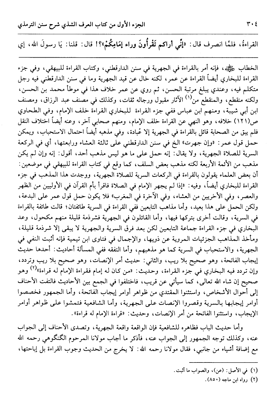 الخطاب، فإنه أمر بالقراءة في الجهرية في سنن الدارقطني، وكتاب القراءة للبيهقي، وفي جزء القراءة للبخاري أيضاً القراءة عن عمر، لكنه خال عن قيد الجهرية وما في سنن الدارقطني فيه رجل متكلم فيه، وعندي يبلغ مرتبة الحسن، ثم روي عن عمر خلاف هذا في موطأ محمد بن الحسن، ولكنه منقطع، والمنقطع من الآثار مقبول ورجاله ثقات، وكذلك في مصنف عبد الرزاق، ومصنف ابن أبي شيبة، ومنهم ابن عباس ففي جزء القراءة للبخاري القراءة خلف الإمام، وفي الطحاوي ص (121) خلافه، وهو النهي عن القراءة خلف الإمام، ومنهم صحابي آخر، وعنه أيضاً اختلاف النقل فلم يبق من الصحابة قائل بالقراءة في الجهرية إلا عُبادة، وفي مذهبه أيضاً احتمال الاستحباب، ويمكن حمل قول عمر: «وإن جهرت» الخ في سنن الدارقطني على ثالثة العشاء ورابعتها، أي في الركعة السرية للصلاة الجهرية، ولا يقال: إنه حمل على ما هو ليس مذهب أحد، أقول: إنه وإن لم يكن مذهب من الأئمة الأربعة لكنه مذهب بعض السلف، كما وقع في كتاب القراءة للبيهقي في موضعين: أن بعض العلماء يقولون بالقراءة في الركعات السرية للصلاة الجهرية، ووجدت هذا المذهب في جزء القراءة للبخاري أيضاً، وفيه: «إذا لم يجهر الإمام في الصلاة فاقرأ بأم القرآن في الأوليين من الظهر والعصر، وفي الأخريين من العشاء، وفي الآخرة في المغرب» فلا يكون حمل قول عمر على البدعة، ولكن الحمل على هذا بعيد، وأما مذاهب التابعين ففي القراءة في السرية طائفتان؛ قالت طائفة بالقراءة في السرية، وقالت أخرى بتركها فيها، وأما القائلون في الجهرية فشرذمة قليلة منهم مكحول، وعد البخاري في جزء القراءة جماعة التابعين لكن بعد فرق السرية والجهرية لا يبقى إلا شرذمة قليلة، ومأخذ المذاهب الجزئيات المروية عن ذويها، والإجمال في فتاوى ابن تيمية فإنه أثبت النفي في الجهرية، والاستحباب في السرية كما هو مذهبهم،