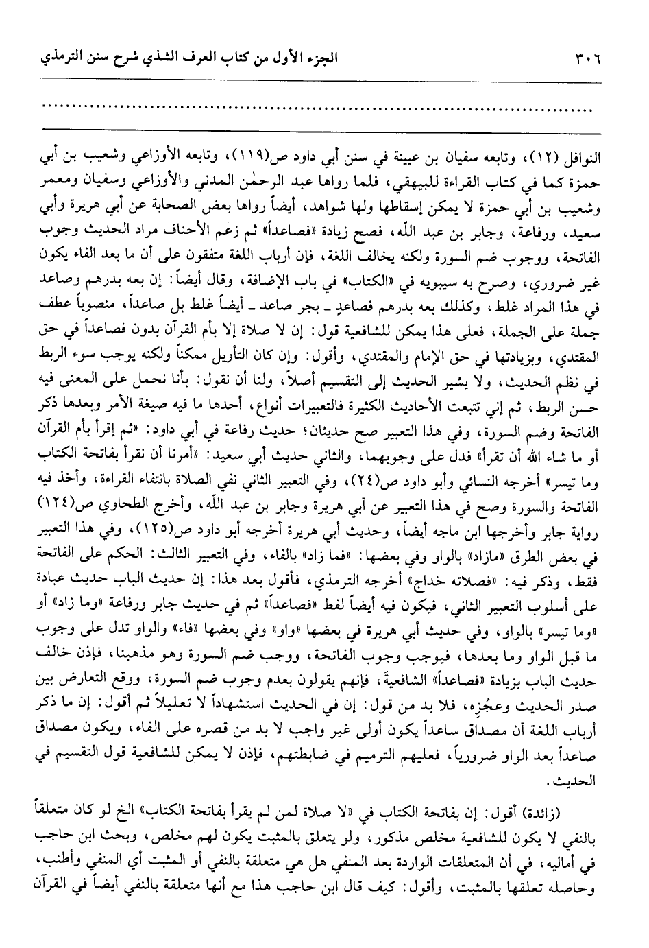 النوافل (12) ، وتابعه سفيان بن عيينة في سنن أبي داود ص (119) ، وتابعه الأوزاعي وشعيب بن أبي حمزة كما في كتاب القراءة للبيهقي، فلما رواها عبد الرحمن المدني والأوزاعي وسفيان ومعمر وشعيب بن أبي حمزة لا يمكن إسقاطها ولها شواهد، أيضاً رواها بعض الصحابة عن أبي هريرة وأبي سعيد، ورفاعة، وجابر بن عبد الله، فصح زيادة «فصاعداً» ثم زعم الأحناف مراد الحديث وجوب الفاتحة، ووجوب ضم السورة ولكنه يخالف اللغة، فإن أرباب اللغة متفقون على أن ما بعد الفاء يكون غير ضروري، وصرح به سيبويه في «الكتاب» في باب الإضافة، وقال أيضاً: إن بعه بدرهم وصاعد في هذا المراد غلط، وكذلك بعه بدرهم فصاعدٍ ـ بجر صاعد ـ أيضاً غلط بل صاعداً، منصوباً عطف جملة على الجملة، فعلى هذا يمكن للشافعية قول: إن لا صلاة إلا بأم القرآن بدون فصاعداً في حق المقتدي، وبزيادتها في حق الإمام والمقتدي، وأقول: وإن كان التأويل ممكناً ولكنه يوجب سوء الربط في نظم الحديث، ولا يشير الحديث إلى التقسيم أصلاً، ولنا أن نقول: بأنا نحمل على المعنى فيه حسن الربط، ثم إني تتبعت الأحاديث الكثيرة فالتعبيرات أنواع، أحدها ما فيه صيغة الأمر وبعدها ذكر الفاتحة وضم السورة، وفي هذا التعبير صح حديثان؛ حديث رفاعة في أبي داود: «ثم إقرأ بأم القرآن أو ما شاء الله أن تقرأ» فدل على وجوبهما، والثاني حديث أبي سعيد: «أمرنا أن نقرأ بفاتحة الكتاب وما تيسر» أخرجه النسائي وأبو داود ص (24) ، وفي التعبير الثاني نفي الصلاة بانتفاء القراءة، وأخذ فيه الفاتحة والسورة وصح في هذا التعبير عن أبي هريرة وجابر بن عبد الله، وأخرج الطحاوي ص (124) رواية جابر وأخرجها ابن ماجه أيضاً، وحديث أبي هريرة أخرجه أبو داود ص (125) ، وفي هذا التعبير في بعض الطرق «مازاد» بالواو وفي بعضها: «فما زاد» بالفاء، وفي التعبير الثالث: الحكم على الفاتحة