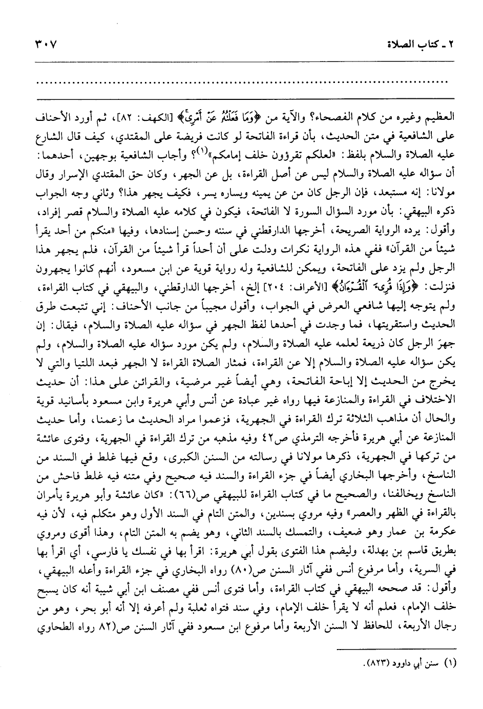 العظيم وغيره من كلام الفصحاء؟ والآية من {وَمَا فَعَلْتُهُ عَنْ أَمْرِي} [الكهف: 82] ، ثم أورد الأحناف على الشافعية في متن الحديث، بأن قراءة الفاتحة لو كانت فريضة على المقتدي، كيف قال الشارع عليه الصلاة والسلام بلفظ: «لعلكم تقرؤون خلف إمامكم» ؟ وأجاب الشافعية بوجهين، أحدهما: أن سؤاله عليه الصلاة والسلام ليس عن أصل القراءة، بل عن الجهر، وكان حق المقتدي الإسرار وقال مولانا: إنه مستبعد، فإن الرجل كان من عن يمينه ويساره يسر، فكيف يجهر هذا؟ وثاني وجه الجواب ذكره البيهقي: بأن مورد السؤال السورة لا الفاتحة، فيكون في كلامه عليه الصلاة والسلام قصر إفراد، وأقول: يرده الرواية الصريحة، أخرجها الدارقطني في سننه وحسن إسنادها، وفيها «منكم من أحد يقرأ شيئاً من القرآن» ففي هذه الرواية نكرات ودلت على أن أحداً قرأ شيئاً من القرآن، فلم يجهر هذا الرجل ولم يزد على الفاتحة، ويمكن للشافعية وله رواية قوية عن ابن مسعود، أنهم كانوا يجهرون فنزلت: {وَإِذَا قُرِئَ الْقُرْآنُ} [الأعراف: 204] إلخ، أخرجها الدارقطني، والبيهقي في كتاب القراءة، ولم يتوجه إليها شافعي العرض في الجواب، وأقول مجيباً من جانب الأحناف: إني تتبعت طرق الحديث واستقريتها، فما وجدت في أحدها لفظ الجهر في سؤاله عليه الصلاة والسلام، فيقال: إن جهرَ الرجل كان ذريعة لعلمه عليه الصلاة والسلام، ولم يكن مورد سؤاله عليه الصلاة والسلام، ولم يكن سؤاله عليه الصلاة والسلام إلا عن القراءة، فمثار الصلاة القراءة لا الجهر فبعد اللتيا والتي لا يخرج من الحديث إلا إباحة الفاتحة، وهي أيضاً غير مرضية، والقرائن على هذا: أن حديث الاختلاف في القراءة والمنازعة فيها رواه غير عبادة عن أنس وأبي هريرة وابن مسعود بأسانيد قوية والحال أن مذاهب الثلاثة ترك القراءة في الجهرية، فزعموا مراد الحديث ما زعمنا، وأما حديث المنازعة