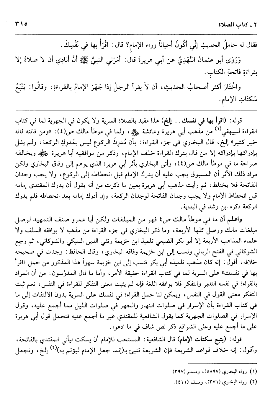 واعلم أن ما في موطأ مالك ص4 فهو من المبلغات ولكن أبا عمرو صنف التمهيد لوصل مبلغات مالك ووصل كلها الأربعة، وما ذكر البخاري في جزء القراءة من مذهبه لا يوافقه السلف ولا علماء المذاهب الأربعة إلا أبو بكر الضبعي تلميذ ابن خزيمة وتقي الدين السبكي والشوكاني، ثم رجع الشوكاني في الفتح الرباني ونسب إلى ابن خزيمة وفاقه البخاري، وقال الحافظ: وجدت في صحيحه خلافه، أقول: إنه كان مذهب تلميذه أبي بكر فنسب إلى ابن خزيمة سهواً هذا المذكور من حمل «اقرأ بها في نفسك» على السرية لما في كتاب القراءة حقيقة الأمر، وأما ما قال المدرِّسون: من أن المراد بالقراءة في نفسه التدبر والتفكر فلا يوافقه اللغة فإنه لم يثبت معنى التفكر للقراءة في النفس، نعم ثبت التفكر معنى القول في النفس، ويمكن لنا حمل القراءة في نفسك على السرية بدون الالتفات إلى ما في كتاب القراءة بأن الإسرار في صلوات النهار والجهر في صلوات الليل مما أجمع عليه، وقول الإسرار في الصلوات الجهرية كما يقول الشافعية للمقتدي غير ما أجمع عليه فنحمل قول أبي هريرة على ما أجمع عليه وعلى الشوافع ذكر نص شاف في ما ادعوا.