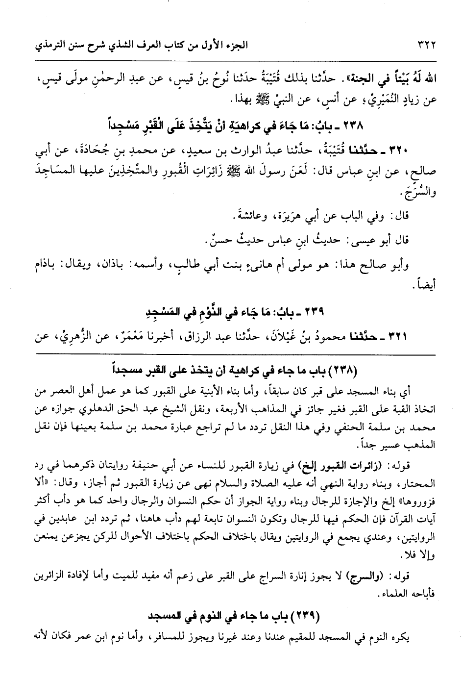 [320] أي بناء المسجد على قبر كان سابقاً، وأما بناء الأبنية على القبور كما هو عمل أهل العصر من اتخاذ القبة على القبر فغير جائز في المذاهب الأربعة، ونقل الشيخ عبد الحق الدهلوي جوازه عن محمد بن سلمة الحنفي وفي هذا النقل تردد ما لم تراجع عبارة محمد بن سلمة بعينها فإن نقل المذهب عسير جداً.