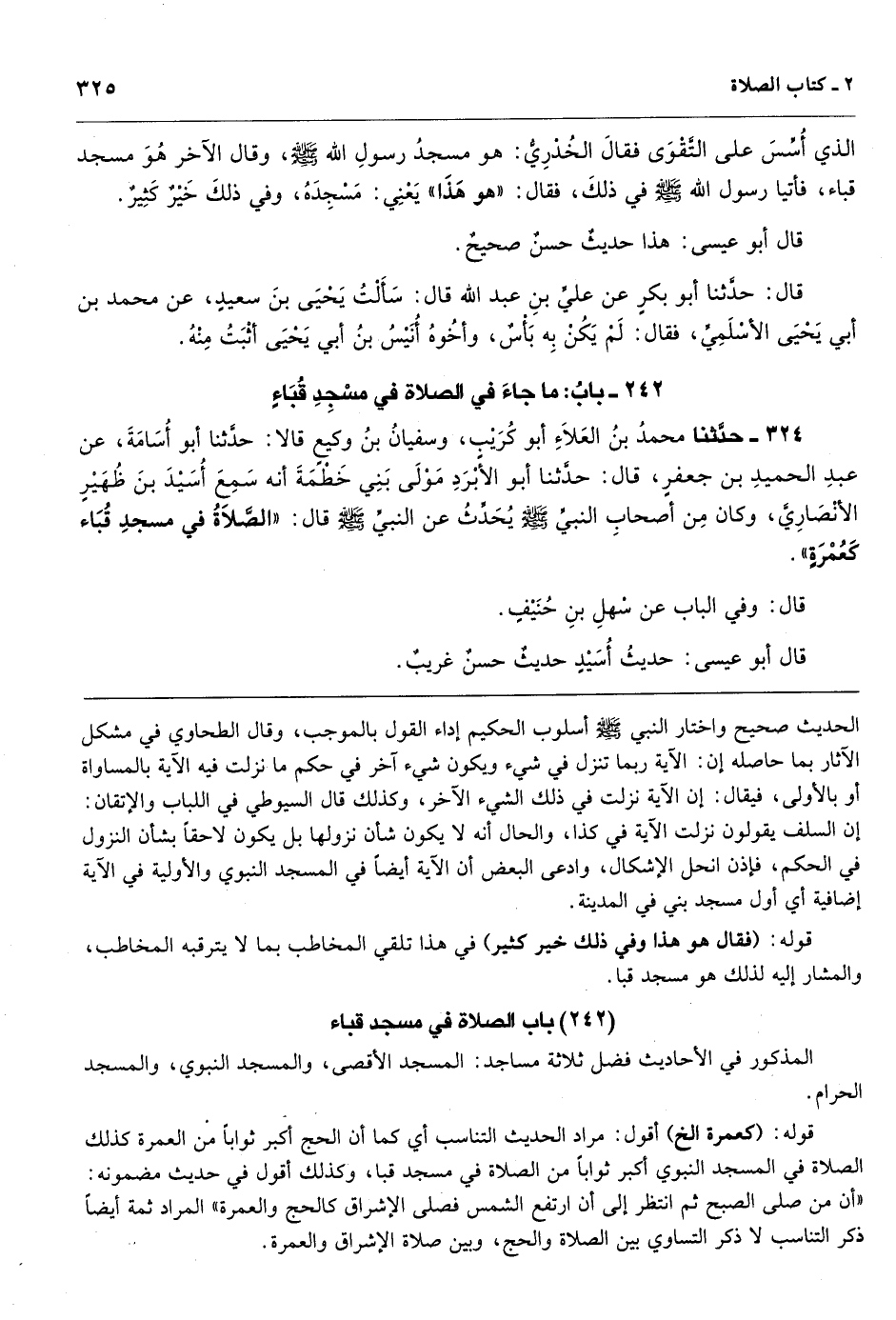 قوله: (كعمرة الخ) أقول: مراد الحديث التناسب أي كما أن الحج أكبر ثواباً من العمرة كذلك الصلاة في المسجد النبوي أكبر ثواباً من الصلاة في مسجد قبا، وكذلك أقول في حديث مضمونه: «أن من صلى الصبح ثم انتظر إلى أن ارتفع الشمس فصلى الإشراق كالحج والعمرة» المراد ثمة أيضاً ذكر التناسب لا ذكر التساوي بين الصلاة والحج، وبين صلاة الإشراق والعمرة.