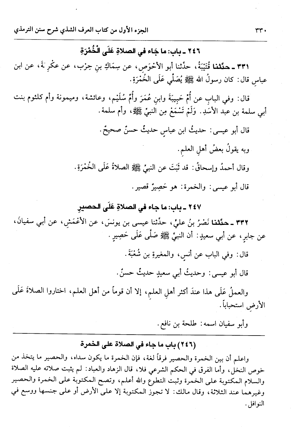 [331] واعلم أن بين الخمرة والحصير فرقاً لغة، فإن الخمرة ما يكون سداه، والحصير ما يتخذ من خوص النخل، وأما الفرق في الحكم الشرعي فلا، قال الزهاد والعباد: لم يثبت صلاته عليه الصلاة والسلام المكتوبة على الخمرة وثبت التطوع والله أعلم، وتصح المكتوبة على الخمرة والحصير وغيرهما عند الثلاثة، وقال مالك: لا تجوز المكتوبة إلا على الأرض أو على جنسها ووسع في النوافل.