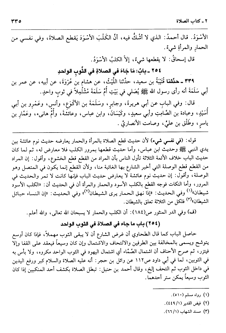 [338] قوله: (في نفسي شيء) لأن حديث قطع الصلاة بالمرأة والحمار يعارضه حديث نوم عائشة بين يدي النبي - صَلَّى اللهُ عَلَيْهِ وَسَلَّمَ - وحديث ابن عباس، وأما حديث قطعها بمرور الكلب فلا معارض له، ثم لما كان حديث الباب خلاف الأئمة الثلاثة تأول الناس بأن المراد من القطع قطع الخشوع، وأقول: إن المراد من القطع قطع الوصلة التي أخبر الشارع بها الغائبة منا، ولأن القطع إنما يكون في المتصل وهو الوصلة، وأقول: إن حديث نوم عائشة لا يعارض حديث الباب فإنها كانت لا تمر والحديث في المرور، وأما النكات فوجه القطع بالكلب الأسود والحمار والمرأة أن في الحديث أن: «الكلب الأسود شيطان» وفي الحديث: «إذا نهق الحمار يرى الشيطان» وفي الحديث: «إن النساء حبائل الشيطان» فلكل من الثلاثة تعلق بالشيطان.