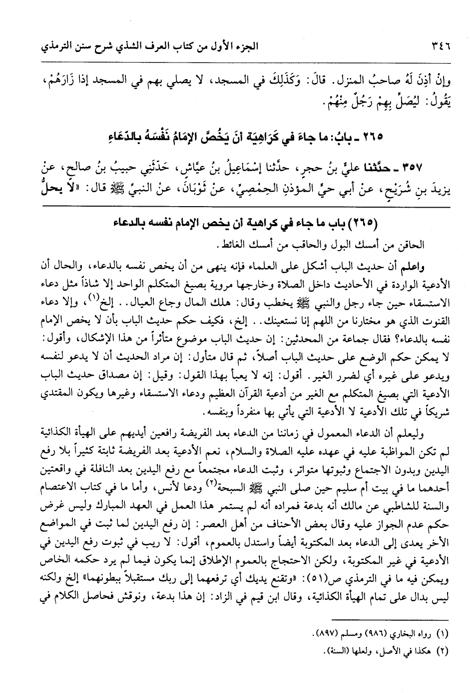 واعلم أن حديث الباب أشكل على العلماء فإنه ينهى من أن يخص نفسه بالدعاء، والحال أن الأدعية الواردة في الأحاديث داخل الصلاة وخارجها مروية بصيغ المتكلم الواحد إلا شاذاً مثل دعاء الاستسقاء حين جاء رجل والنبي - صَلَّى اللهُ عَلَيْهِ وَسَلَّمَ - يخطب وقال: هلك المال وجاع العيال. . إلخ، وإلا دعاء القنوت الذي هو مختارنا من اللهم إنا نستعينك. . إلخ، فكيف حكم حديث الباب بأن لا يخص الإمام نفسه بالدعاء؟ فقال جماعة من المحدثين: إن حديث الباب موضوع متأثراً من هذا الإشكال، وأقول: لا يمكن حكم الوضع على حديث الباب أصلاً، ثم قال متأول: إن مراد الحديث أن لا يدعو لنفسه ويدعو على غيره أي لضرر الغير. أقول: إنه لا يعبأ بهذا القول: وقيل: إن مصداق حديث الباب الأدعية التي بصيغ المتكلم مع الغير من أدعية القرآن العظيم ودعاء الاستسقاء وغيرها ويكون المقتدي شريكاً في تلك الأدعية لا الأدعية التي يأتي بها منفرداً وبنفسه.