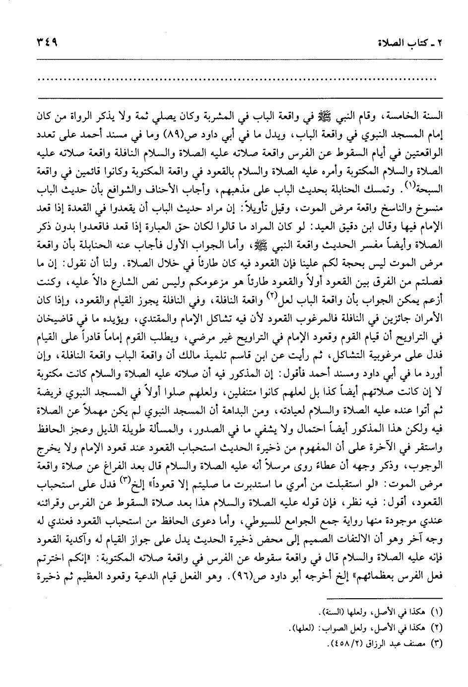 السنة الخامسة، وقام النبي - صَلَّى اللهُ عَلَيْهِ وَسَلَّمَ - في واقعة الباب في المشربة وكان يصلي ثمة ولا يذكر الرواة من كان إمام المسجد النبوي في واقعة الباب، ويدل ما في أبي داود ص (89) وما في مسند أحمد على تعدد الواقعتين في أيام السقوط عن الفرس واقعة صلاته عليه الصلاة والسلام النافلة واقعة صلاته عليه الصلاة والسلام المكتوبة وأمره عليه الصلاة والسلام بالقعود في واقعة المكتوبة وكانوا قائمين في واقعة السبحة. وتمسك الحنابلة بحديث الباب على مذهبهم، وأجاب الأحناف والشوافع بأن حديث الباب منسوخ والناسخ واقعة مرض الموت، وقيل تأويلاً: إن مراد حديث الباب أن يقعدوا في القعدة إذا قعد الإمام فيها وقال ابن دقيق العيد: لو كان المراد ما قالوا لكان حق العبارة إذا قعد فاقعدوا بدون ذكر الصلاة وأيضاً مفسر الحديث واقعة النبي - صَلَّى اللهُ عَلَيْهِ وَسَلَّمَ -، وأما الجواب الأول فأجاب عنه الحنابلة بأن واقعة مرض الموت ليس بحجة لكم علينا فإن القعود فيه كان طارئاً في خلال الصلاة. ولنا أن نقول: إن ما فصلتم من الفرق بين القعود أولاً والقعود طارئاً هو مزعومكم وليس نص الشارع دالاً عليه، وكنت أزعم يمكن الجواب بأن واقعة الباب لعل واقعة النافلة، وفي النافلة يجوز القيام والقعود، وإذا كان الأمران جائزين في النافلة فالمرغوب القعود لأن فيه تشاكل الإمام والمقتدي، ويؤيده ما في قاضيخان في التراويح أن قيام القوم وقعود الإمام في التراويح غير مرضي، ويطلب القوم إماماً قادراً على القيام فدل على مرغوبية التشاكل، ثم رأيت عن ابن قاسم تلميذ مالك أن واقعة الباب واقعة النافلة، وإن أورد ما في أبي داود ومسند أحمد فأقول: إن المذكور فيه أن صلاته عليه الصلاة والسلام كانت مكتوبة لا إن كانت صلاتهم أيضاً كذا بل لعلهم كانوا متنفلين، ولعلهم صلوا أولاً في المسجد النبوي فريضة ثم أتوا عنده عليه الصلاة والسلام