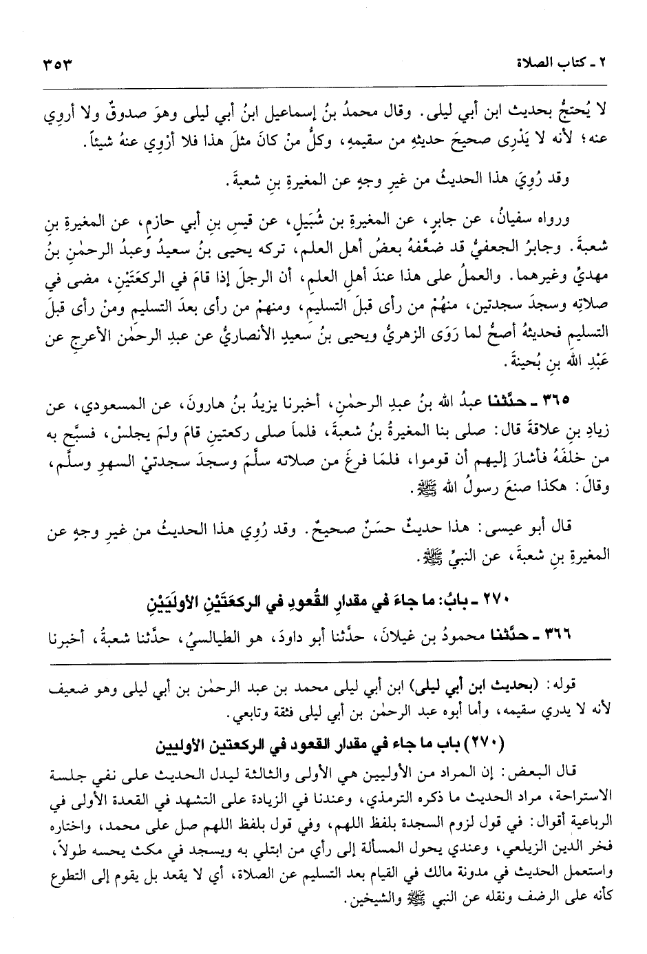 [366] قال البعض: إن المراد من الأوليين هي الأولى والثالثة ليدل الحديث على نفي جلسة الاستراحة، مراد الحديث ما ذكره الترمذي، وعندنا في الزيادة على التشهد في القعدة الأولى في الرباعية أقوال: في قول لزوم السجدة بلفظ اللهم، وفي قول بلفظ اللهم صل على محمد، واختاره فخر الدين الزيلعي، وعندي يحول المسألة إلى رأي من ابتلي به ويسجد في مكث يحسه طولاً، واستعمل الحديث في مدونة مالك في القيام بعد التسليم عن الصلاة، أي لا يقعد بل يقوم إلى التطوع كأنه على الرضف ونقله عن النبي - صَلَّى اللهُ عَلَيْهِ وَسَلَّمَ - والشيخين.