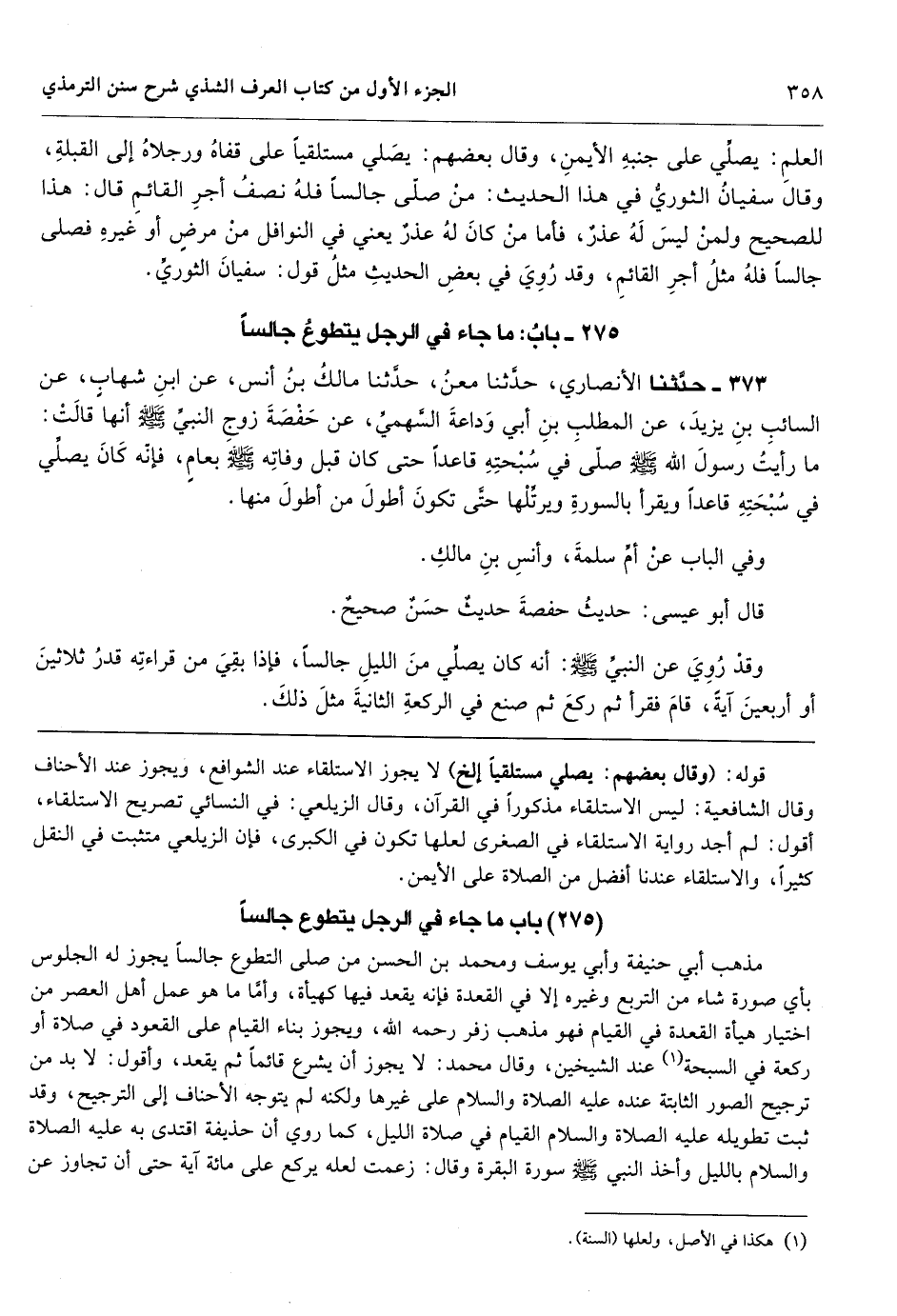 [373] مذهب أبي حنيفة وأبي يوسف ومحمد بن الحسن من صلى التطوع جالساً يجوز له الجلوس بأي صورة شاء من التربع وغيره إلا في القعدة فإنه يقعد فيها كهيأة، وأمَّا ما هو عمل أهل العصر من اختيار هيأة القعدة في القيام فهو مذهب زفر رحمه الله، ويجوز بناء القيام على القعود في صلاة أو ركعة في السبحة عند الشيخين، وقال محمد: لا يجوز أن يشرع قائماً ثم يقعد، وأقول: لا بد من ترجيح الصور الثابتة عنده عليه الصلاة والسلام على غيرها ولكنه لم يتوجه الأحناف إلى الترجيح، وقد ثبت تطويله عليه الصلاة والسلام القيام في صلاة الليل، كما روي أن حذيفة اقتدى به عليه الصلاة والسلام بالليل وأخذ النبي - صَلَّى اللهُ عَلَيْهِ وَسَلَّمَ - سورة البقرة وقال: زعمت لعله يركع على مائة آية حتى أن تجاوز عن المائة،