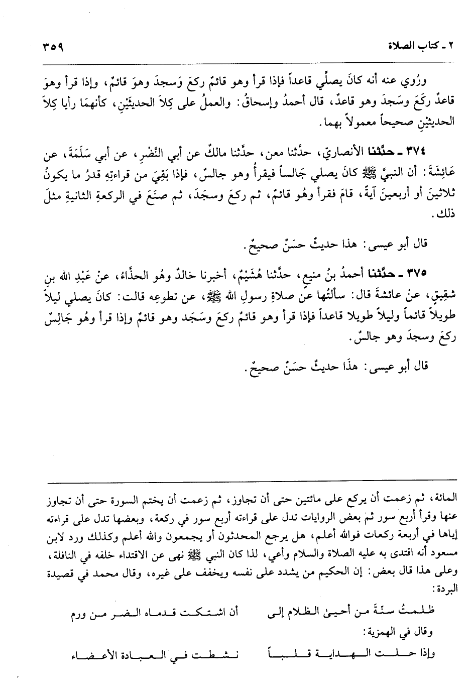ثم زعمت أن يركع على مائتين حتى أن تجاوز، ثم زعمت أن يختم السورة حتى أن تجاوز عنها وقرأ أربع سور ثم بعض الروايات تدل على قراءته أربع سور في ركعة، وبعضها تدل على قراءته إياها في أربعة ركعات فوالله أعلم، هل يرجع المحدثون أو يجمعون والله أعلم وكذلك ورد لابن مسعود أنه اقتدى به عليه الصلاة والسلام وأعي، لذا كان النبي - صَلَّى اللهُ عَلَيْهِ وَسَلَّمَ - نهى عن الاقتداء خلفه في النافلة، وعلى هذا قال بعض: إن الحكيم من يشدد على نفسه ويخفف على غيره، وقال محمد في قصيدة البردة: