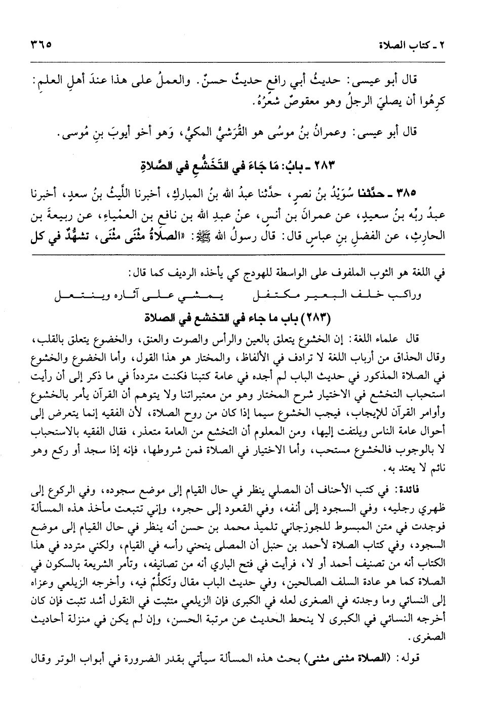 [385] قال علماء اللغة: إن الخشوع يتعلق بالعين والرأس والصوت والعنق، والخضوع يتعلق بالقلب، وقال الحذاق من أرباب اللغة لا ترادف في الألفاظ، والمختار هو هذا القول، وأما الخضوع والخشوع في الصلاة المذكور في حديث الباب لم أجده في عامة كتبنا فكنت متردداً في ما ذكر إلى أن رأيت استحباب التخشع في الاختيار شرح المختار وهو من معتبراتنا ولا يتوهم أن القرآن يأمر بالخشوع وأوامر القرآن للإيجاب، فيجب الخشوع سيما إذا كان من روح الصلاة، لأن الفقيه إنما يتعرض إلى أحوال عامة الناس ويلتفت إليها، ومن المعلوم أن التخشع من العامة متعذر، فقال الفقيه بالاستحباب لا بالوجوب فالخشوع مستحب، وأما الاختيار في الصلاة فمن شروطها، فإنه إذا سجد أو ركع وهو نائم لا يعتد به.