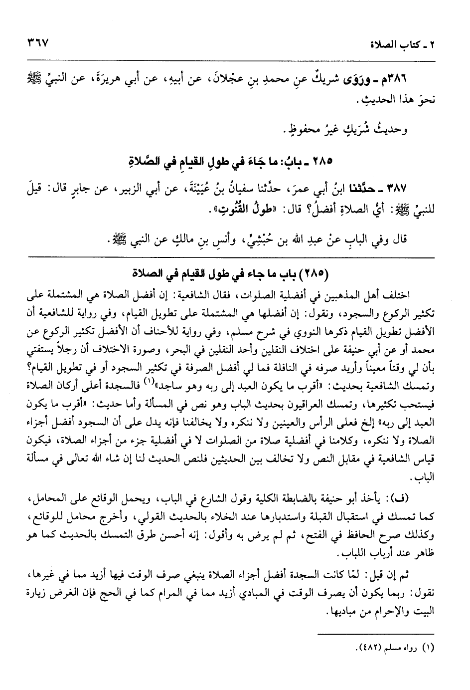 [387] اختلف أهل المذهبين في أفضلية الصلوات، فقال الشافعية: إن أفضل الصلاة هي المشتملة على تكثير الركوع والسجود، ونقول: إن أفضلها هي المشتملة على تطويل القيام، وفي رواية للشافعية أن الأفضل تطويل القيام ذكرها النووي في شرح مسلم، وفي رواية للأحناف أن الأفضل تكثير الركوع عن محمد أو عن أبي حنيفة على اختلاف النقلين وأحد النقلين في البحر، وصورة الاختلاف أن رجلاً يستفتي بأن لي وقتاً معيناً وأريد صرفه في النافلة فما لي أفضل الصرفة في تكثير السجود أو في تطويل القيام؟ وتمسك الشافعية بحديث: «أقرب ما يكون العبد إلى ربه وهو ساجد» فالسجدة أعلى أركان الصلاة فيستحب تكثيرها، وتمسك العراقيون بحديث الباب وهو نص في المسألة وأما حديث: «أقرب ما يكون العبد إلى ربه» إلخ فعلى الرأس والعينين ولا ننكره ولا يخالفنا فإنه يدل على أن السجود أفضل أجزاء الصلاة ولا ننكره، وكلامنا في أفضلية صلاة من الصلوات لا في أفضلية جزء من أجزاء الصلاة، فيكون قياس الشافعية في مقابل النص ولا تخالف بين الحديثين فلنص الحديث لنا إن شاء الله تعالى في مسألة الباب.