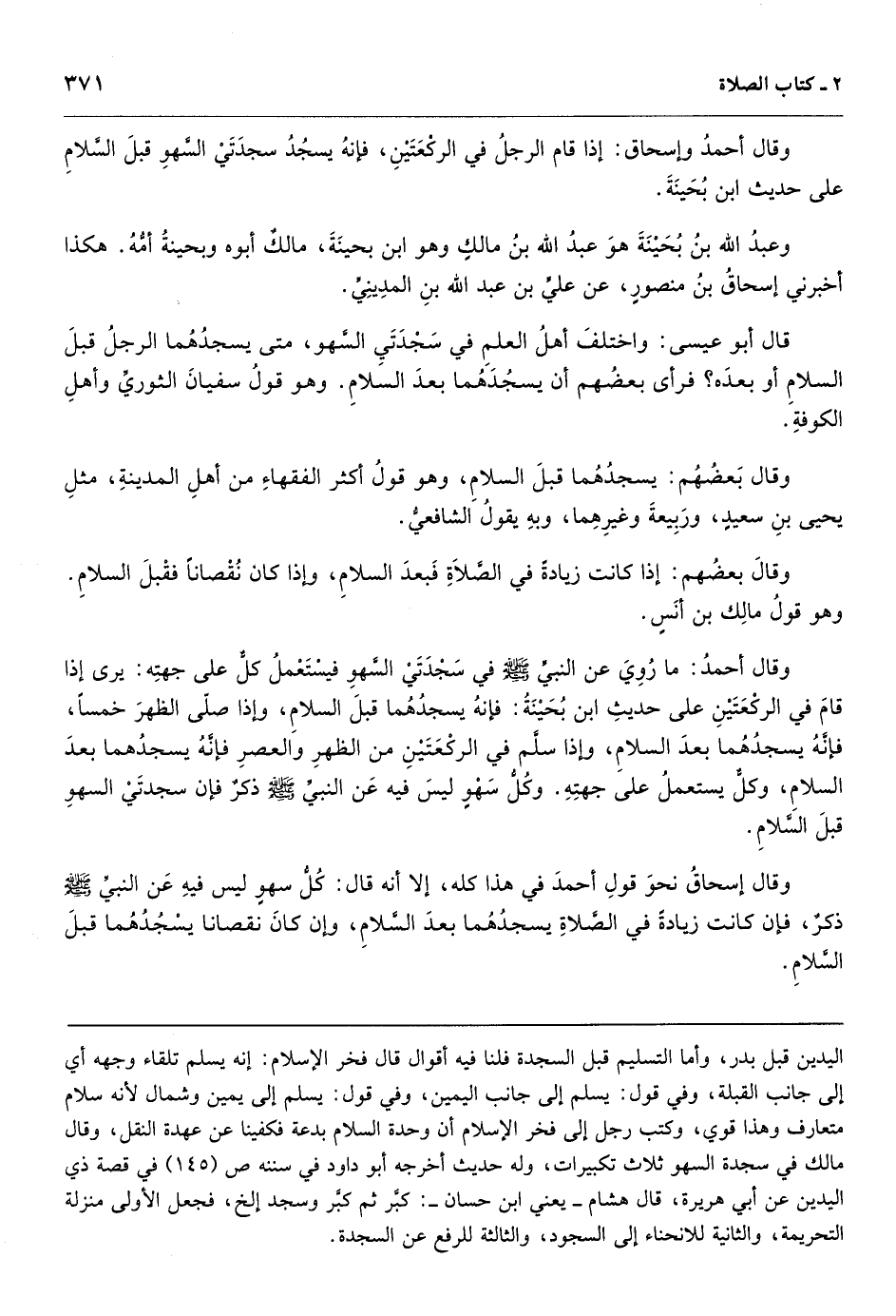 اليدين قبل بدر، وأما التسليم قبل السجدة فلنا فيه أقوال قال فخر الإسلام: إنه يسلم تلقاء وجهه أي إلى جانب القبلة، وفي قول: يسلم إلى جانب اليمين، وفي قول: يسلم إلى يمين وشمال لأنه سلام متعارف وهذا قوي، وكتب رجل إلى فخر الإسلام أن وحدة السلام بدعة فكفينا عن عهدة النقل، وقال مالك في سجدة السهو ثلاث تكبيرات، وله حديث أخرجه أبو داود في سننه ص (145) في قصة ذي اليدين عن أبي هريرة، قال هشام ـ يعني ابن حسان ـ: كبَّر ثم كبَّر وسجد إلخ، فجعل الأولى منزلة التحريمة، والثانية للانحناء إلى السجود، والثالثة للرفع عن السجدة.