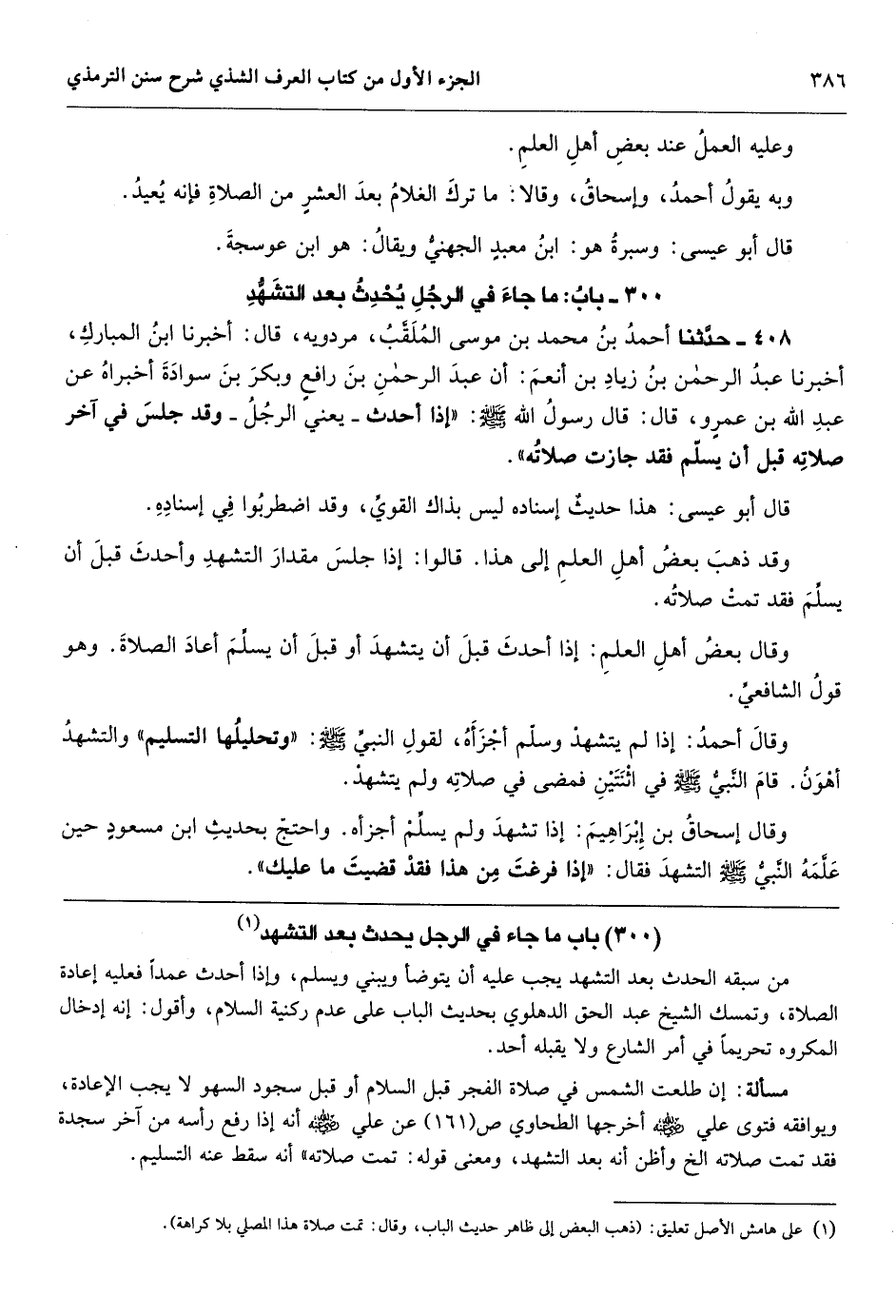 [408] من سبقه الحدث بعد التشهد يجب عليه أن يتوضأ ويبني ويسلم، وإذا أحدث عمداً فعليه إعادة الصلاة، وتمسك الشيخ عبد الحق الدهلوي بحديث الباب على عدم ركنية السلام، وأقول: إنه إدخال المكروه تحريماً في أمر الشارع ولا يقبله أحد.