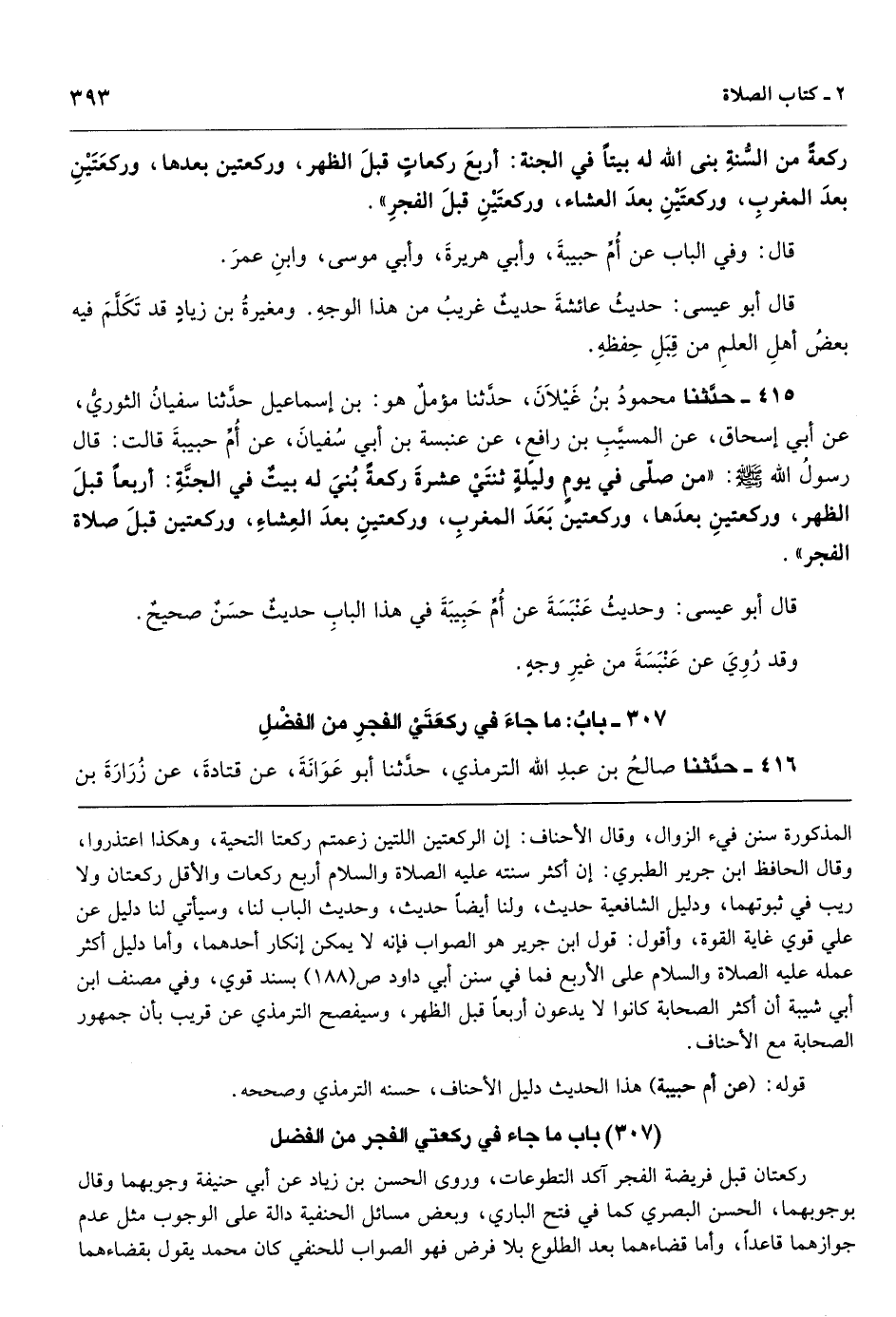 [416] ركعتان قبل فريضة الفجر آكد التطوعات، وروى الحسن بن زياد عن أبي حنيفة وجوبهما وقال بوجوبهما، الحسن البصري كما في فتح الباري، وبعض مسائل الحنفية دالة على الوجوب مثل عدم جوازهما قاعداً، وأما قضاءهما بعد الطلوع بلا فرض فهو الصواب للحنفي كان محمد يقول بقضاءهما