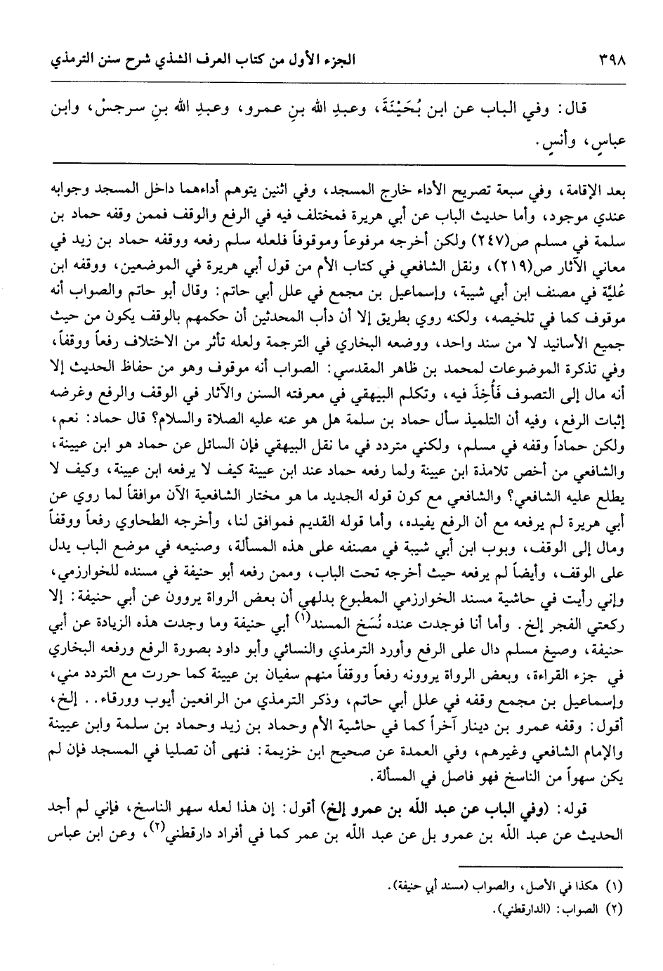 حنيفة وما وجدت هذه الزيادة عن أبي حنيفة، وصيغ مسلم دال على الرفع وأورد الترمذي والنسائي وأبو داود بصورة الرفع ورفعه البخاري في جزء القراءة، وبعض الرواة يروونه رفعاً ووقفاً منهم سفيان بن عيينة كما حررت مع التردد مني، وإسماعيل بن مجمع وقفه في علل أبي حاتم، وذكر الترمذي من الرافعين أيوب وورقاء. . إلخ، أقول: وقفه عمرو بن دينار آخراً كما في حاشية الأم وحماد بن زيد وحماد بن سلمة وابن عيينة والإمام الشافعي وغيرهم، وفي العمدة عن صحيح ابن خزيمة: فنهى أن تصليا في المسجد فإن لم يكن سهواً من الناسخ فهو فاصل في المسألة.