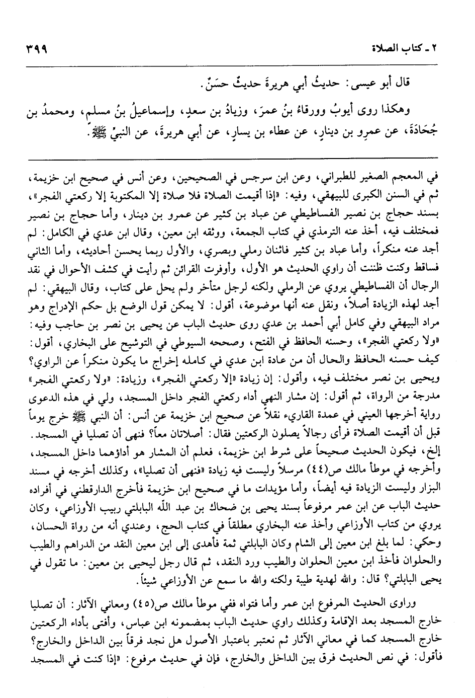 في المعجم الصغير للطبراني، وعن ابن سرجس في الصحيحين، وعن أنس في صحيح ابن خزيمة، ثم في السنن الكبرى للبيهقي، وفيه: «إذا أقيمت الصلاة فلا صلاة إلا المكتوبة إلا ركعتي الفجر» ، بسند حجاج بن نصير الفساطيطي عن عباد بن كثير عن عمرو بن دينار، وأما حجاج بن نصير فمختلف فيه، أخذ عنه الترمذي في كتاب الجمعة، ووثقه ابن معين، وقال ابن عدي في الكامل: لم أجد عنه منكراً، وأما عباد بن كثير فاثنان رملي وبصري، والأول ربما يحسن أحاديثه، وأما الثاني فساقط وكنت ظننت أن راوي الحديث هو الأول، وأوفرت القرائن ثم رأيت في كشف الأحوال في نقد الرجال أن الفساطيطي يروي عن الرملي ولكنه لرجل متأخر ولم يحل على كتاب، وقال البيهقي: لم أجد لهذه الزيادة أصلاً، ونقل عنه أنها موضوعة، أقول: لا يمكن قول الوضع بل حكم الإدراج وهو مراد البيهقي وفي كامل أبي أحمد بن عدي روى حديث الباب عن يحيى بن نصر بن حاجب وفيه: «ولا ركعتي الفجر» ، وحسنه الحافظ في الفتح، وصححه السيوطي في التوشيح على البخاري، أقول: كيف حسنه الحافظ والحال أن من عادة ابن عدي في كامله إخراج ما يكون منكراً عن الراوي؟ ويحيى بن نصر مختلف فيه، وأقول: إن زيادة «إلا ركعتي الفجر» ، وزيادة: «ولا ركعتي الفجر» مدرجة من الرواة، ثم أقول: إن مشار النهي أداء ركعتي الفجر داخل المسجد، ولي في هذه الدعوى رواية أخرجها العيني في عمدة القاريء نقلاً عن صحيح ابن خزيمة عن أنس: أن النبي - صَلَّى اللهُ عَلَيْهِ وَسَلَّمَ - خرج يوماً قبل أن أقيمت الصلاة فرأى رجالاً يصلون الركعتين فقال: أصلاتان معاً؟ فنهى أن تصليا في المسجد. إلخ، فيكون الحديث صحيحاً على شرط ابن خزيمة، فعلم أن المشار هو أداؤهما داخل المسجد، وأخرجه في موطأ مالك ص (44) مرسلاً وليست فيه زيادة «فنهى أن تصليا» ، وكذلك أخرجه في مسند البزار وليست الزيادة فيه أيضاً، وأما مؤيدات ما