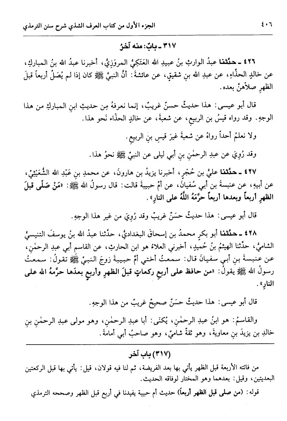 قوله: (من صلى قبل الظهر أربعاً) حديث أم حبيبة يفيدنا في أربع قبل الظهر وصححه الترمذي