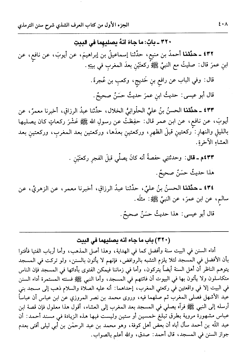 [432] أداء السنن في البيت سنة وأفضل كما في الهداية، وهذا أصل المذهب، وأما أرباب الفتيا فأفتوا بأن الأفضل في المسجد لئلا يلزم التشبه بالروافض، فإنهم لا يأتون بالسنن، ولو تركت في المسجد يتوهم الناظر أن أهل السنة أيضاً يتركون، وأما في زماننا فيمكن الفتوى بأدائها في المسجد فإن الناس متكاسلون ولا يأتون بها في البيوت أن فاتتهم في المسجد، وأما النبي - صَلَّى اللهُ عَلَيْهِ وَسَلَّمَ - فسنته المستمرة أداء السنن في البيت إلا في واقعتين في ركعتي المغرب، إحداهما: أنه عليه الصلاة والسلام ذهب إلى مسجد بني عبد الأشهل فصلى المغرب ثم صلهما فيه، وروى محمد بن نصر المروزي عن ابن عباس أن عباساً أرسله إلى النبي - صَلَّى اللهُ عَلَيْهِ وَسَلَّمَ - فرآه يصلي في المسجد بعد المغرب إلى العشاء، أقول هذا معلول فإن قصة ابن عباس مشهورة مروية بطرق تبلغ خمسين أو ستين وليست فيها هذه الزيادة في مسند أحمد: أن عبد الله بن أحمد سأل أباه أن بعض أهل كوفة، وهو محمد بن عبد الرحمن بن أبي ليلى أفتى بعدم جواز السنن في المسجد، قال أحمد: صدق، والله أعلم بالصواب.