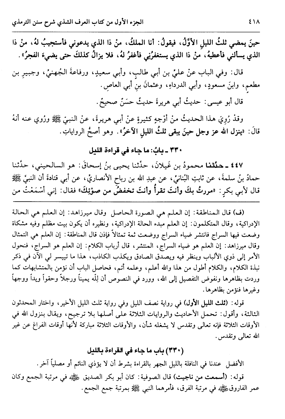 قوله: (ثلث الليل الأول) في رواية نصف الليل وفي رواية ثلث الليل الأخير، واختار المحدثون الثالثة، وأقول: تحمل الأحاديث والروايات الثلاثة على أصلها بلا ترجيح، ويقال بنزول الله في الأوقات الثلاثة فإنه تعالى وتقدس لا يشغله شأن، والأوقات الثلاثة مباركة لأنها أوقات الفراغ عن غير الله تعالى وتقدس.