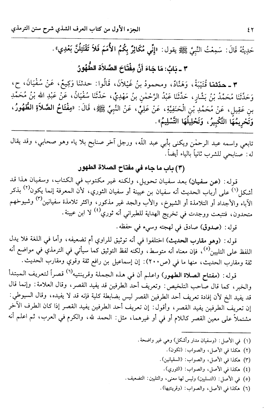 قوله: (مفتاح الصلاة الطهور) واعلم أن في هذه الجملة وقرينتيه قصراً لتعريف المبتدأ والخبر، كما قال صاحب التلخيص: وتعريف أحد الطرفين قد يفيد القصر، وقال العلامة: وإنما قال قد يفيد الخ لأن إفادة تعريف أحد الطرفين القصر ليس بضابطة كلية فإنه قد لا يفيده، وقال السيوطي: إن تعريف الطرفين يفيد القصر، وأقول: إن تعريف أحد الطرفين يفيد القصر إذا كان الطرف الآخر مشتملاً على معين القصر كاللام أو في أو غيرهما، مثل: الحمد لله، والكرم في العرب، ثم اعلم أنه