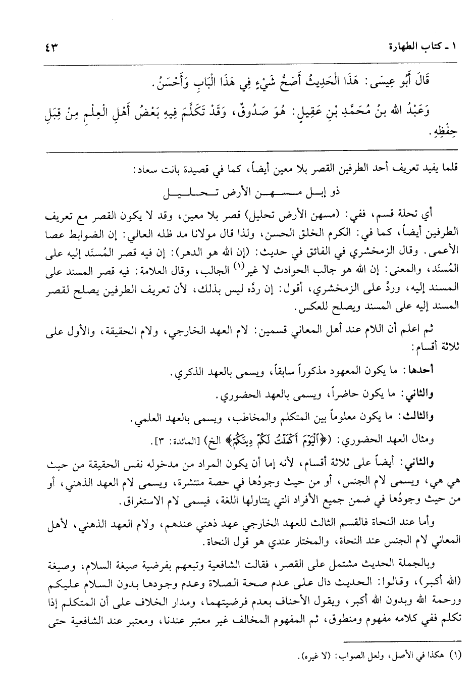 ثم اعلم أن اللام عند أهل المعاني قسمين: لام العهد الخارجي، ولام الحقيقة، والأول على ثلاثة أقسام: