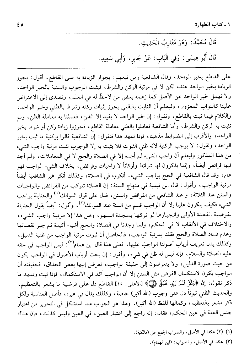 على القاطع بخبر الواحد، وقال الشافعية ومن تبعهم: بجواز الزيادة به على القاطع، أقول: يجوز الزيادة بخبر الواحد عندنا لكن لا في مرتبة الركن والشرط، فيثبت الوجوب والسنية بالخبر الواحد، ولا نهمل خبر الواحد عن الأصل كما زعمه بعض من لاحظّ له في العلم، وتصدى إلى الاعتراض علينا كالنواب المعزول، وليعلم أن الثابت بالظني يجوز إثبات ركنه وشرط بالظني وخبر الواحد، والكلام فيما ثبت بالقاطع، ونقول: إن خبر الواحد لا يفيد إلا الظن، فعملنا به معاملة الظن، ولم تثبت به الركن والشرط، وأما الشافعية فعاملوا بالظني معاملة القاطع، فجوزوا زيادة ركن أو شرط بخبر الواحد، والأقرب إلى الضوابط مذهبنا، فإذا تمهد هذا فنقول: إن الشافعية قالوا بركنية ما ثبت بخبر الواحد، ونقول: لا يوجب الركنية لأنه ظني الثبوت فلا يثبت به إلا الوجوب تثبت مرتبة واجب الشيء من هذا المذكور وليعلم أن واجب الشيء لم أجده إلا في الصلاة والحج لا في المعاملات، ولم أجد فيها فرائض أيضاً، وإنما يذكرون لها شرائط وأركاناً لا واجبات وفرائض، بخلاف الشيء الواجب فهو عام، وقد قال الشافعية في الحج بواجب الشيء، أنكروه في الصلاة، وكذلك أنكر غير الشافعية أيضاً مرتبة الواجب، وأقول: قال ابن تيمية في منهاج السنة: إن الصلاة تتركب من الفرائض والواجبات والسنن عند الثلاثة، وعند الشافعي من الفرائض والسنن، فدل على قول الموالك والحنابلة بواجب الشيء فكيف ينكرون علينا إلا أن الواجب قسم من السنة عند الموالك، وأقول: أيضاً يقول الحنابلة بفرضية القعدة الأولى وانجبارها لو تركها بسجدة السهو، وهل هذا إلا مرتبة واجب الشيء، والاختلاف في الألقاب لا في الحكم، ولما وجدنا في الصلاة والحج أشياء أكيدة ثم جبر نقصانها وعدم فساد الصلاة والحج فقلنا بمرتبة الواجب، فالحاصل أن ثبوت مرتبة الواجب من ظنية الدليل، وكذلك يدل تعريف أرباب أصولنا الواجبَ