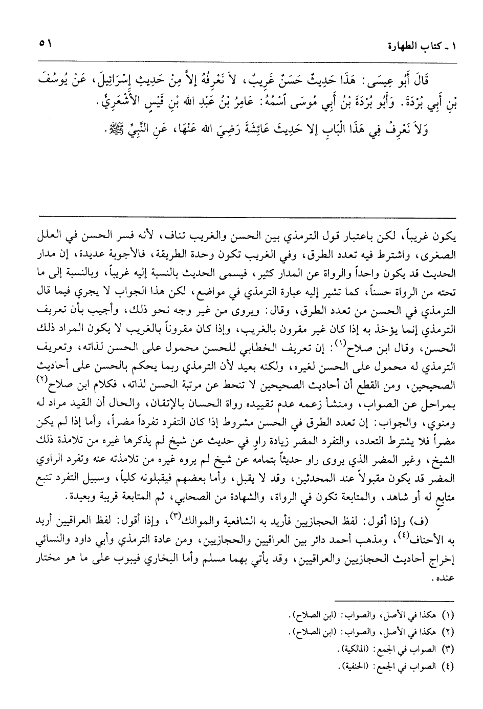 يكون غريباً، لكن باعتبار قول الترمذي بين الحسن والغريب تناف، لأنه فسر الحسن في العلل الصغرى، واشترط فيه تعدد الطرق، وفي الغريب تكون وحدة الطريقة، فالأجوبة عديدة، إن مدار الحديث قد يكون واحداً والرواة عن المدار كثير، فيسمى الحديث بالنسبة إليه غريباً، وبالنسبة إلى ما تحته من الرواة حسناً، كما تشير إليه عبارة الترمذي في مواضع، لكن هذا الجواب لا يجري فيما قال الترمذي في الحسن من تعدد الطرق، وقال: ويروى من غير وجه نحو ذلك، وأجيب بأن تعريف الترمذي إنما يؤخذ به إذا كان غير مقرون بالغريب، وإذا كان مقروناً بالغريب لا يكون المراد ذلك الحسن، وقال ابن صلاح: إن تعريف الخطابي للحسن محمول على الحسن لذاته، وتعريف الترمذي له محمول على الحسن لغيره، ولكنه بعيد لأن الترمذي ربما يحكم بالحسن على أحاديث الصحيحين، ومن القطع أن أحاديث الصحيحين لا تنحط عن مرتبة الحسن لذاته، فكلام ابن صلاح بمراحل عن الصواب، ومنشأ زعمه عدم تقييده رواة الحسان بالإتقان، والحال أن القيد مراد له ومنوي، والجواب: إن تعدد الطرق في الحسن مشروط إذا كان التفرد تفرداً مضراً، وأما إذا لم يكن مضراً فلا يشترط التعدد، والتفرد المضر زيادة راوٍ في حديث عن شيخ لم يذكرها غيره من تلامذة ذلك الشيخ، وغير المضر الذي يروى راو حديثاً بتمامه عن شيخ لم يروه غيره من تلامذته عنه وتفرد الراوي المضر قد يكون مقبولاً عند المحدثين، وقد لا يقبل، وأما بعضهم فيقبلونه كلياً، وسبيل التفرد تتبع متابعٍ له أو شاهد، والمتابعة تكون في الرواة، والشهادة من الصحابي، ثم المتابعة قريبة وبعيدة.