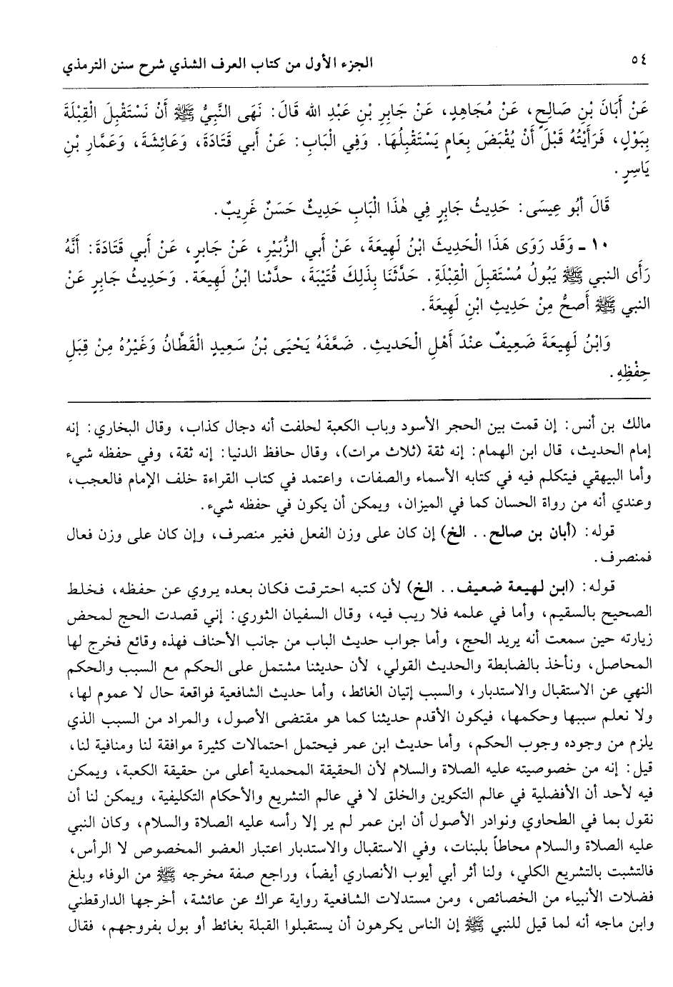 قوله: (ابن لهيعة ضعيف. . الخ) لأن كتبه احترقت فكان بعده يروي عن حفظه، فخلط الصحيح بالسقيم، وأما في علمه فلا ريب فيه، وقال السفيان الثوري: إني قصدت الحج لمحض زيارته حين سمعت أنه يريد الحج، وأما جواب حديث الباب من جانب الأحناف فهذه وقائع فخرج لها المحاصل، ونأخذ بالضابطة والحديث القولي، لأن حديثنا مشتمل على الحكم مع السبب والحكم النهي عن الاستقبال والاستدبار، والسبب إتيان الغائط، وأما حديث الشافعية فواقعة حال لا عموم لها، ولا نعلم سببها وحكمها، فيكون الأقدم حديثنا كما هو مقتضى الأصول، والمراد من السبب الذي يلزم من وجوده وجوب الحكم، وأما حديث ابن عمر فيحتمل احتمالات كثيرة موافقة لنا ومنافية لنا، قيل: إنه من خصوصيته عليه الصلاة والسلام لأن الحقيقة المحمدية أعلى من حقيقة الكعبة، ويمكن فيه لأحد أن الأفضلية في عالم التكوين والخلق لا في عالم التشريع والأحكام التكليفية، ويمكن لنا أن نقول بما في الطحاوي ونوادر الأصول أن ابن عمر لم ير إلا رأسه عليه الصلاة والسلام، وكان النبي عليه الصلاة والسلام محاطاً بلبنات، وفي الاستقبال والاستدبار اعتبار العضو المخصوص لا الرأس، فالتشبت بالتشريع الكلي، ولنا أثر أبي أيوب الأنصاري أيضاً، وراجع صفة مخرجه - صَلَّى اللهُ عَلَيْهِ وَسَلَّمَ - من الوفاء وبلغ فضلات الأنبياء من الخصائص، ومن مستدلات الشافعية رواية عراك عن عائشة، أخرجها الدارقطني وابن ماجه أنه لما قيل للنبي - صَلَّى اللهُ عَلَيْهِ وَسَلَّمَ - إن الناس يكرهون أن يستقبلوا القبلة بغائط أو بول بفروجهم، فقال