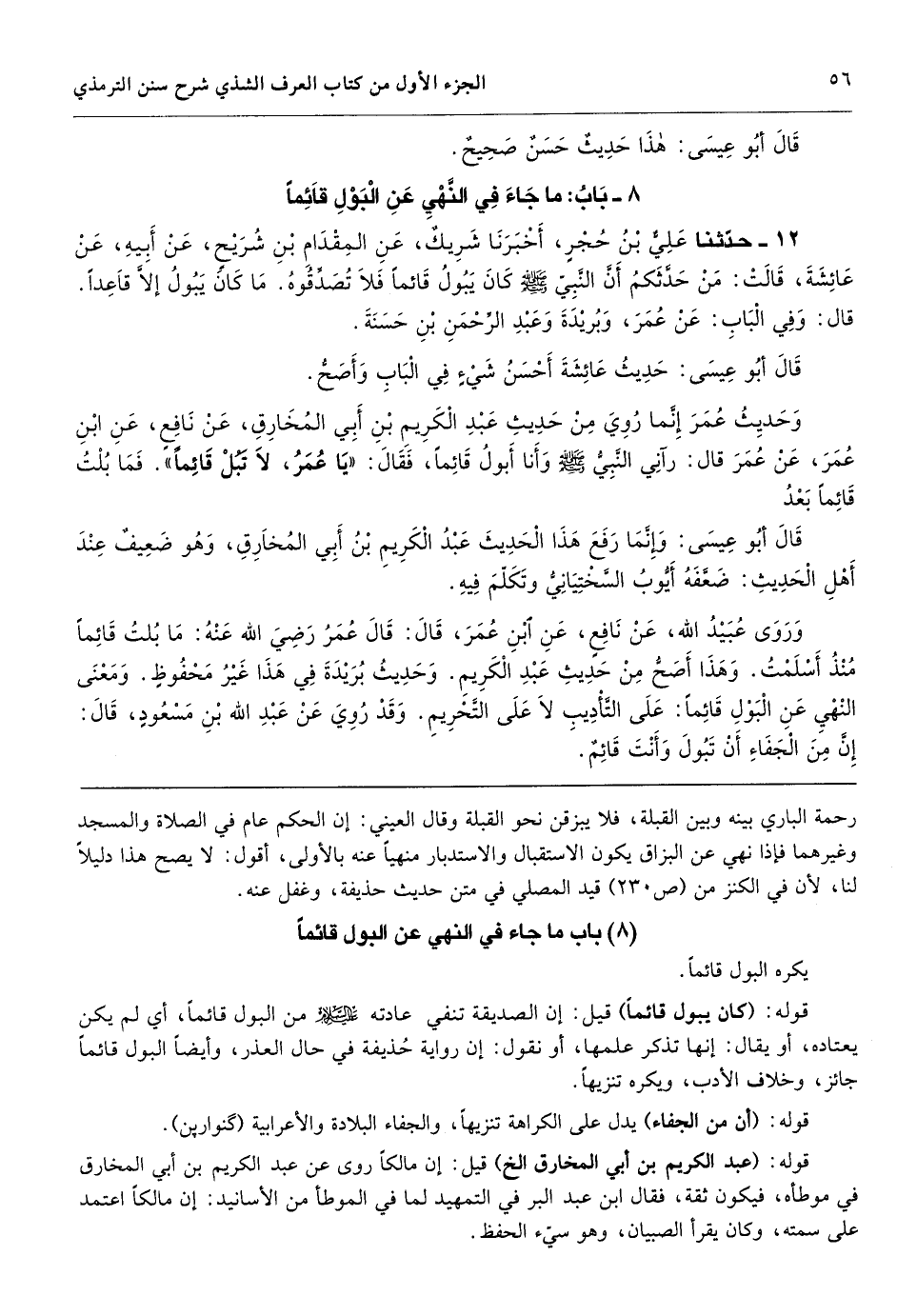 [12] قوله: (كان يبول قائماً) قيل: إن الصديقة تنفي عادته من البول قائماً، أي لم يكن يعتاده، أو يقال: إنها تذكر علمها، أو نقول: إن رواية حُذيفة في حال العذر، وأيضاً البول قائماً جائز، وخلاف الأدب، ويكره تنزيهاً.