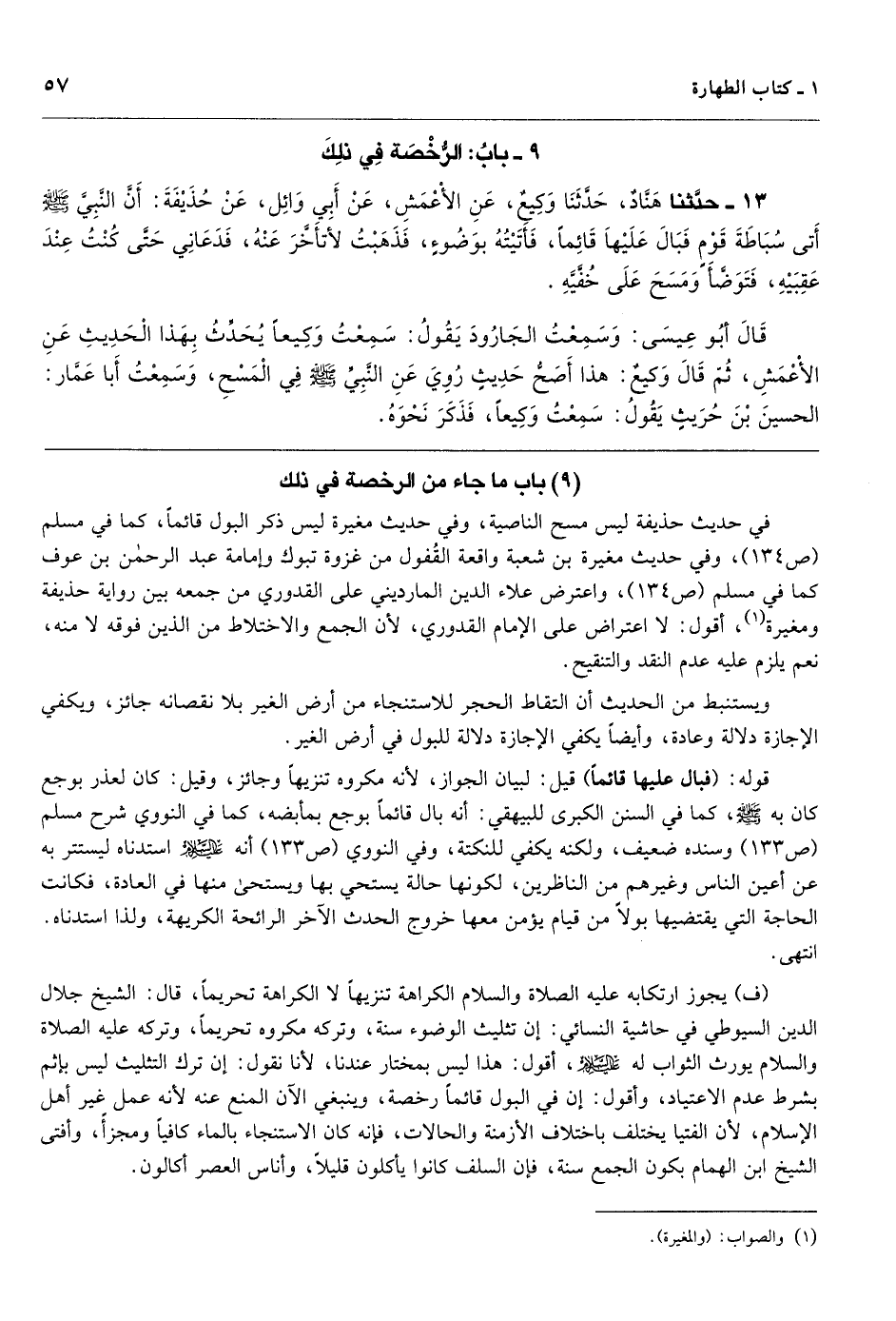 [13] في حديث حذيفة ليس مسح الناصية، وفي حديث مغيرة ليس ذكر البول قائماً، كما في مسلم (ص134) ، وفي حديث مغيرة بن شعبة واقعة القُفول من غزوة تبوك وإمامة عبد الرحمن بن عوف كما في مسلم (ص134) ، واعترض علاء الدين المارديني على القدوري من جمعه بين رواية حذيفة ومغيرة، أقول: لا اعتراض على الإمام القدوري، لأن الجمع والاختلاط من الذين فوقه لا منه، نعم يلزم عليه عدم النقد والتنقيح.