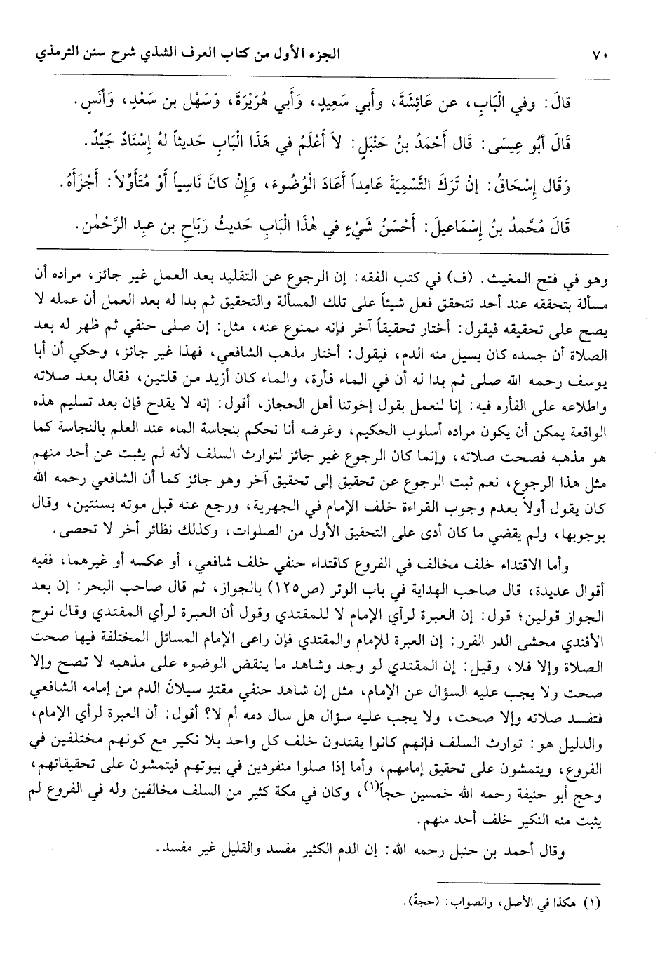 وهو في فتح المغيث. (ف) في كتب الفقه: إن الرجوع عن التقليد بعد العمل غير جائز، مراده أن مسألة بتحققه عند أحد تتحقق فعل شيئاً على تلك المسألة والتحقيق ثم بدا له بعد العمل أن عمله لا يصح على تحقيقه فيقول: أختار تحقيقاً آخر فإنه ممنوع عنه، مثل: إن صلى حنفي ثم ظهر له بعد الصلاة أن جسده كان يسيل منه الدم، فيقول: أختار مذهب الشافعي، فهذا غير جائز، وحكي أن أبا يوسف رحمه الله صلى ثم بدا له أن في الماء فأرة، والماء كان أزيد من قلتين، فقال بعد صلاته واطلاعه على الفأره فيه: إنا لنعمل بقول إخوتنا أهل الحجاز، أقول: إنه لا يقدح فإن بعد تسليم هذه الواقعة يمكن أن يكون مراده أسلوب الحكيم، وغرضه أنا نحكم بنجاسة الماء عند العلم بالنجاسة كما هو مذهبه فصحت صلاته، وإنما كان الرجوع غير جائز لتوارث السلف لأنه لم يثبت عن أحد منهم مثل هذا الرجوع، نعم ثبت الرجوع عن تحقيق إلى تحقيق آخر وهو جائز كما أن الشافعي رحمه الله كان يقول أولاً بعدم وجوب القراءة خلف الإمام في الجهرية، ورجع عنه قبل موته بسنتين، وقال بوجوبها، ولم يقضي ما كان أدى على التحقيق الأول من الصلوات، وكذلك نظائر أخر لا تحصى.