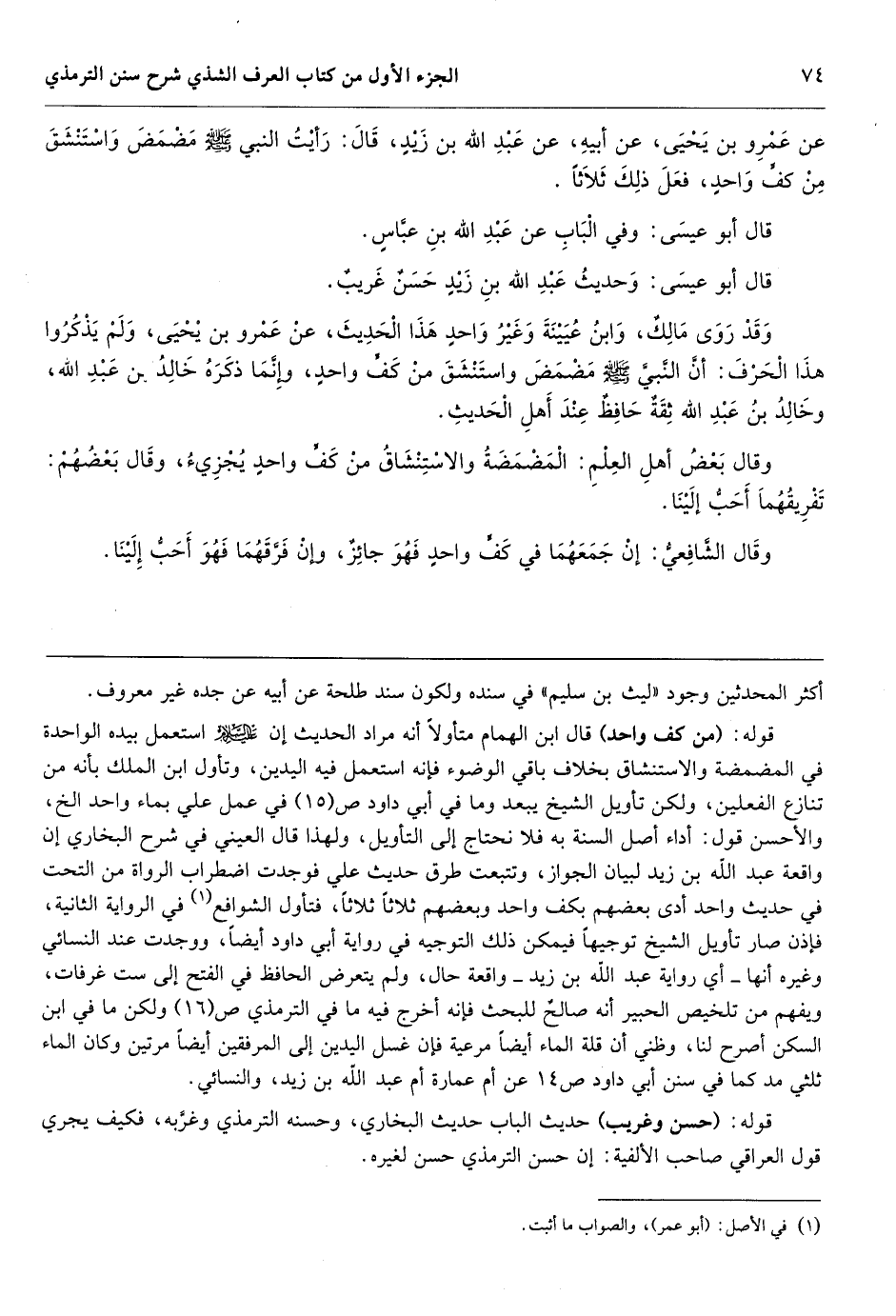 قوله: (من كف واحد) قال ابن الهمام متأولاً أنه مراد الحديث إن استعمل بيده الواحدة في المضمضة والاستنشاق بخلاف باقي الوضوء فإنه استعمل فيه اليدين، وتأول ابن الملك بأنه من تنازع الفعلين، ولكن تأويل الشيخ يبعد وما في أبي داود ص (15) في عمل علي بماء واحد الخ، والأحسن قول: أداء أصل السنة به فلا نحتاج إلى التأويل، ولهذا قال العيني في شرح البخاري إن واقعة عبد الله بن زيد لبيان الجواز، وتتبعت طرق حديث علي فوجدت اضطراب الرواة من التحت في حديث واحد أدى بعضهم بكف واحد وبعضهم ثلاثاً ثلاثاً، فتأول الشوافع في الرواية الثانية، فإذن صار تأويل الشيخ توجيهاً فيمكن ذلك التوجيه في رواية أبي داود أيضاً، ووجدت عند النسائي وغيره أنها ـ أي رواية عبد الله بن زيد ـ واقعة حال، ولم يتعرض الحافظ في الفتح إلى ست غرفات، ويفهم من تلخيص الحبير أنه صالحٌ للبحث فإنه أخرج فيه ما في الترمذي ص (16) ولكن ما في ابن السكن أصرح لنا، وظني أن قلة الماء أيضاً مرعية فإن غسل اليدين إلى المرفقين أيضاً مرتين وكان الماء ثلثي مد كما في سنن أبي داود ص14 عن أم عمارة أم عبد الله بن زيد، والنسائي.