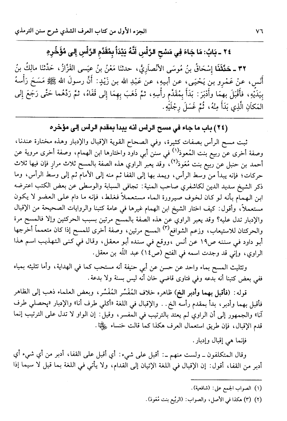 [32] ثبت مسح الرأس بصفات كثيرة، وفي الصحاح القوية الإقبال والإدبار وهذه مختارة عندنا، وصفة أخرى عن ربيع بنت المُعوذ في سنن أبي داود واختارها ابن الهمام، وصفة أخرى مروية عن أحمد بن حنبل عن ربيع بنت مُعَوذ، وقد يعبر الراوي هذه الصفة بالمسح ثلاث مرارٍ فإن فيها ثلاث حركات؛ فإنه يبدأ من وسط الرأس، ويمد بها إلى القفا ثم منه إلى الأمام ثم إلى وسط الرأس، وما ذكر الشيخ سديد الدين لكاشفري صاحب المنية: تجافى السبابة والوسطى عن بعض الكتب اعترضه ابن الهمام بأنه لو كان لخوف صيرورة الماء مستعملاً فغلط، فإنه ما دام على العضو لا يكون مستعملاً، وأقول: كيف اختار الشيخ ابن الهمام غيرها في عامة كتبنا والروايات الصحيحة من الإقبال والإدبار تدل عليه؟ وقد يعبر الراوي عن هذه الصفة بالمسح مرتين بسبب الحركتين وإلا فالمسح مرة والحركتان للاستيعاب، وزعم الشوافع المسح مرتين، وصفة أخرى للمسح إذا كان متعمماً أخرجها أبو داود في سننه ص19 عن أنس، ووقع في سنده أبو معقل، وقال في كنى التهذيب اسم هذا الراوي، وإني قد وجدت اسمه في الفتح (ص14) عبد الله بن معقل.