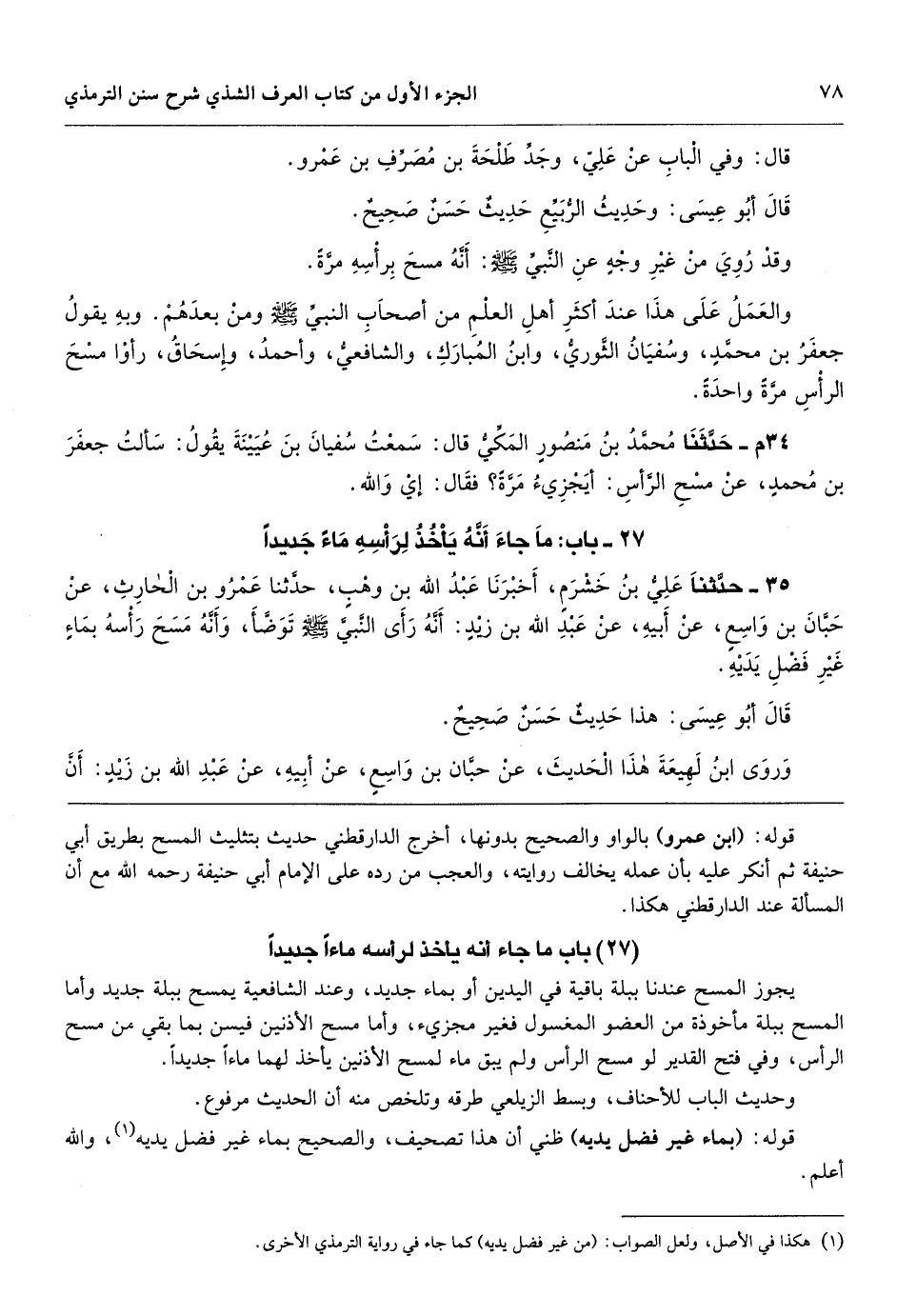 قوله: (ابن عمرو) بالواو والصحيح بدونها، أخرج الدارقطني حديث بتثليث المسح بطريق أبي حنيفة ثم أنكر عليه بأن عمله يخالف روايته، والعجب من رده على الإمام أبي حنيفة رحمه الله مع أن المسألة عند الدارقطني هكذا.