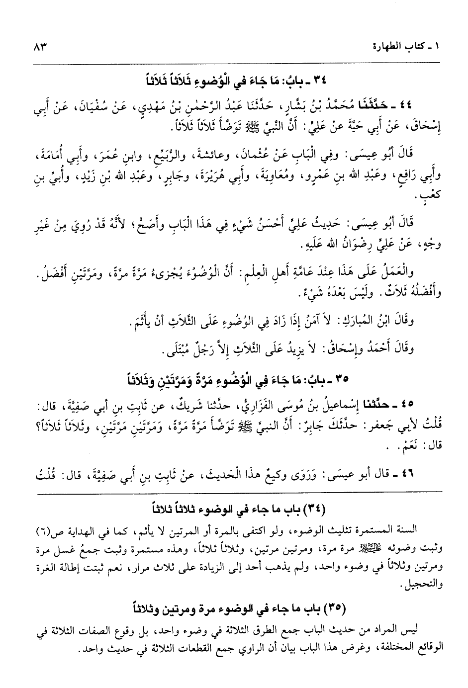 [44] السنة المستمرة تثليث الوضوء، ولو اكتفى بالمرة أو المرتين لا يأثم، كما في الهداية ص (6) وثبت وضوئه مرة مرة، ومرتين مرتين، وثلاثاً ثلاثاً، وهذه مستمرة وثبت جمعُ غسل مرة ومرتين وثلاثاً في وضوء واحد، ولم يذهب أحد إلى الزيادة على ثلاث مرار، نعم ثبتت إطالة الغرة والتحجيل.