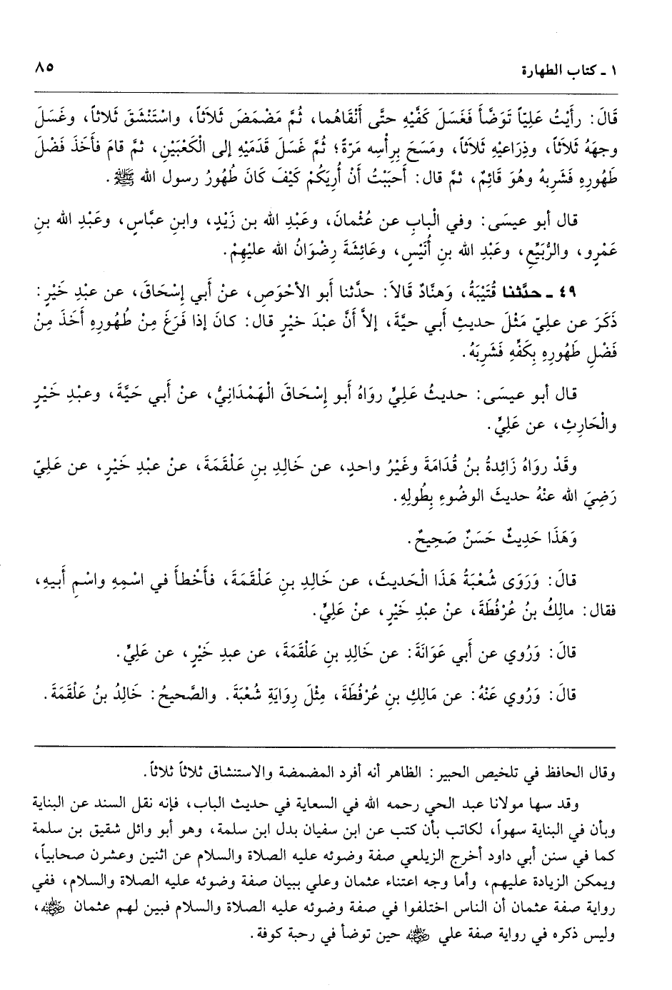 وقد سها مولانا عبد الحي رحمه الله في السعاية في حديث الباب، فإنه نقل السند عن البناية وبأن في البناية سهواً، لكاتب بأن كتب عن ابن سفيان بدل ابن سلمة، وهو أبو وائل شقيق بن سلمة كما في سنن أبي داود أخرج الزيلعي صفة وضوئه عليه الصلاة والسلام عن اثنين وعشرن صحابياً، ويمكن الزيادة عليهم، وأما وجه اعتناء عثمان وعلي ببيان صفة وضوئه عليه الصلاة والسلام، ففي رواية صفة عثمان أن الناس اختلفوا في صفة وضوئه عليه الصلاة والسلام فبين لهم عثمان، وليس ذكره في رواية صفة علي حين توضأ في رحبة كوفة.
